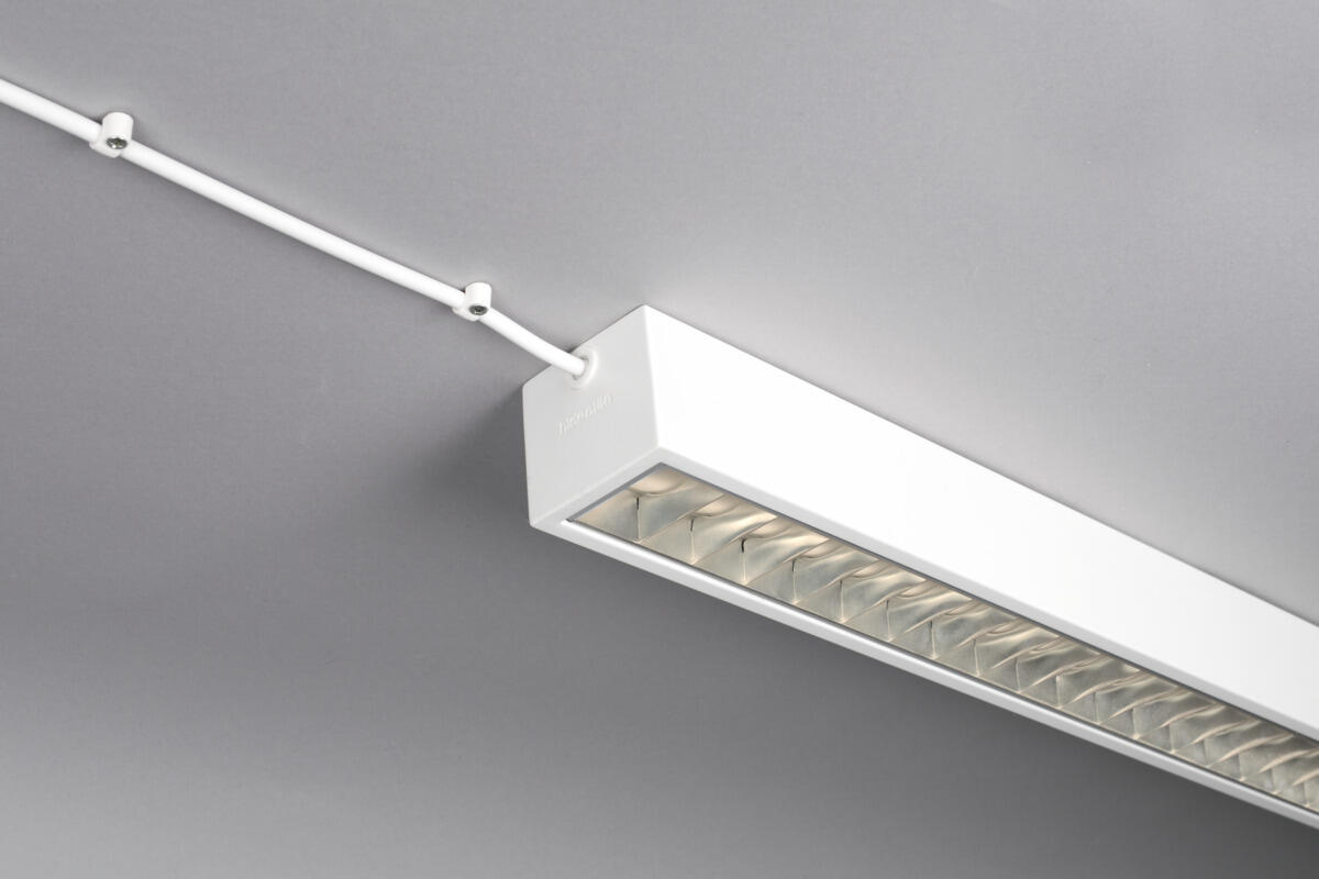 Sisäkäyttöön soveltuva riippuvalaisin toimistoihin, kokoustiloihin ja koulusaleihin. Valkoiseksi tai mustaksi maalattu alumiinirunko. Musta tai läpinäkyvä johto tilauksesta. Kaksoisparabolinen häikäisysuoja antaa häikäisemättömän valokuvion. Täyttää päätetyö- ja UGR- vaatimukset (UGR<19 toimistoissa) standardiolosuhteissa. Valonjakauma 30/70 ja 50/50 sekä ohjaukset: On/Off, vetokytkin himmennykseen, DALI/Push, PIR-sensori. Toimitetaan kattoon sopivilla asennustarvikkeilla. Mukana valkoinen maadoitettu johto sekä DALI ja 5-napainen johto, vapaat päät.