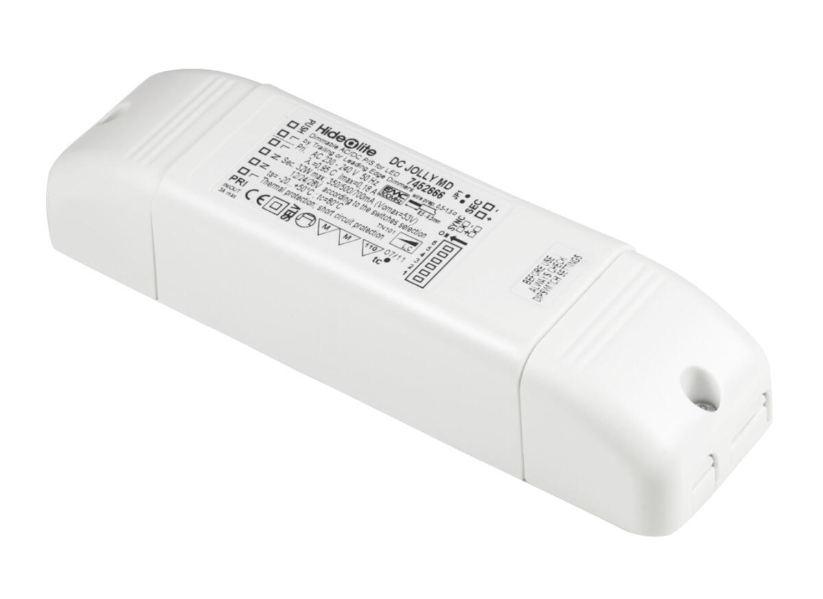 All-in-one -muuntaja LEDeille, sisäänrakennettu PWM-himmennin helpottaa asennusta suoraan DIN-kiskoon suurissa hankkeissa ja pienissä remonteissa. Voi ohjata ja himmentää monia LED-valonlähdemalleja. Ulostulo tasajännite DC (200 - 800 mA, porras 50 mA). 1-10kpl ohjaimia voidaan liittää samaan ryhmään ja ohjata yhdestä tai useammasta paikasta jousipalautteisella painonapilla, potentiometrillä 1-10 V tai väylä-/KNX-järjestelmällä. Mukana 15 cm synkronointikaapeli.