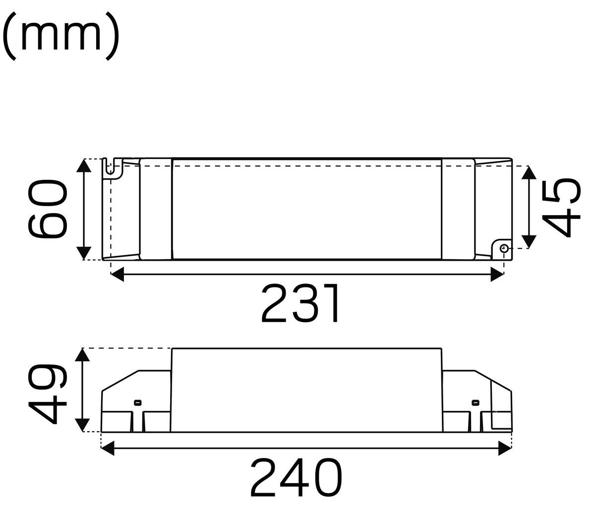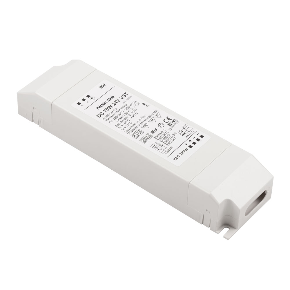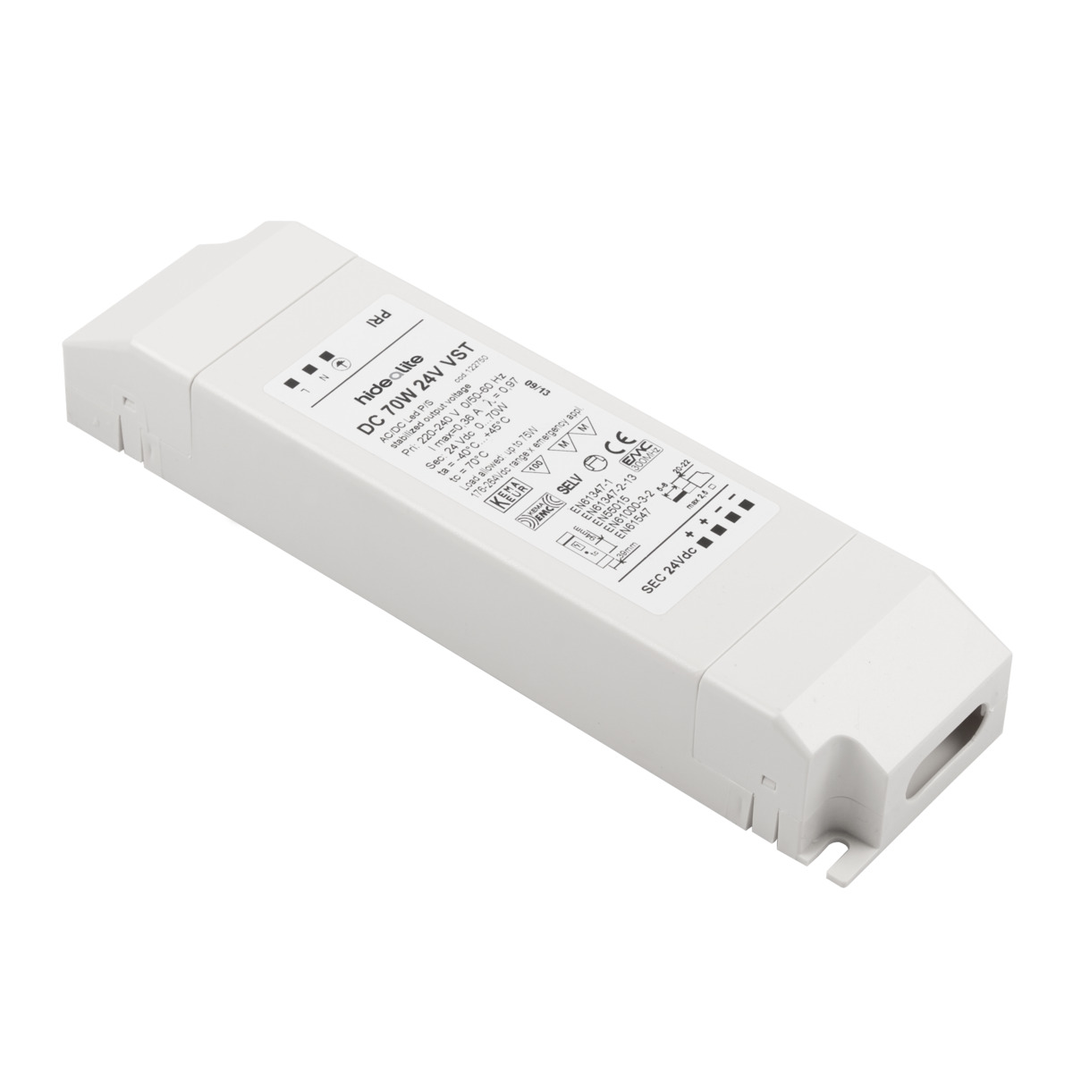 Tasajännitemuuntaja 12/24 V LED-valaisimille parannetulla tekniikalla ja laajalla tehoalueella. Voidaan kuormittaa nollasta enimmäistehoon (0-70 W). IP67, esiasennetut johdot.