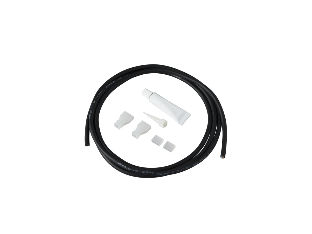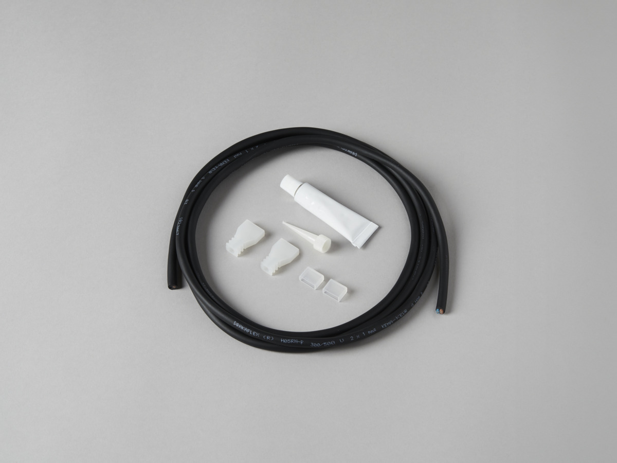 Liitäntäsarja LEDstrip 24V IP67. Sopii LED-nauhalle 24V IP67 Low, Mid, High, sekä LEDstrip 24V IP67 TW, RGB ja RGBW. Sisältää 2 päätyosaa ja 2 kaapelin päätä, 2 metrin kaapelin sekä 10 ml silikoniliiman.