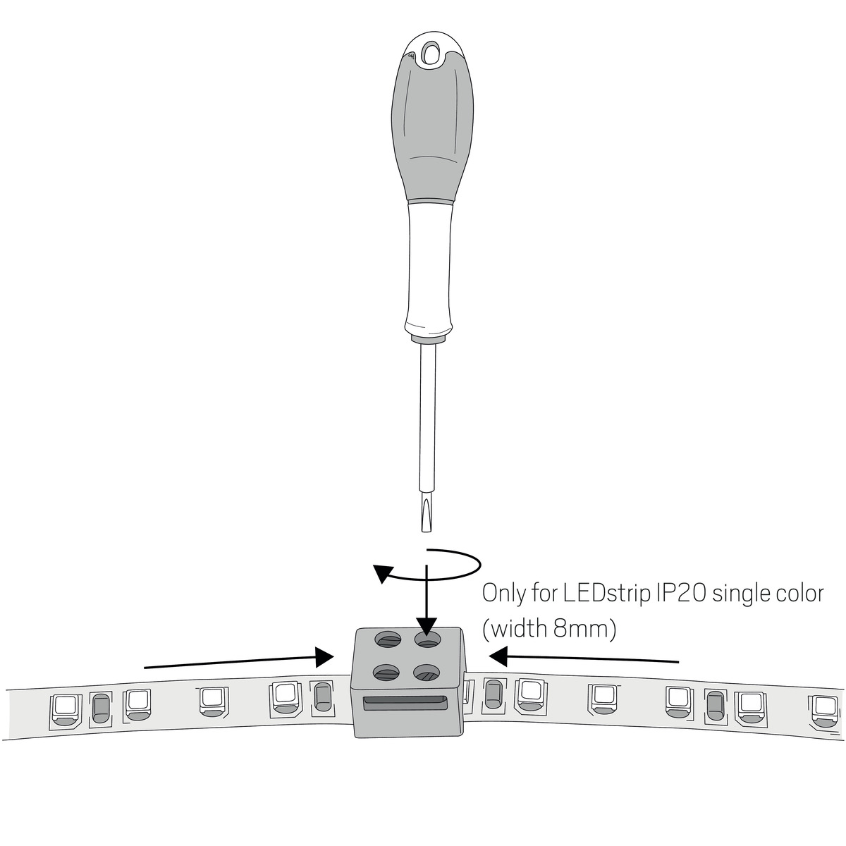 LEDstrip-ruuviliitäntä, yksivärinen, IP20, kun halutaan välttää juottaminen ja valita johto itse, 0,5-1,5 mm²:n johdoille. Erittäin vankka ja turvallinen liitos asennukseen. Toimitetaan 5 kpl pakkauksessa. Sopii useisiin alumiiniprofiileihimme.