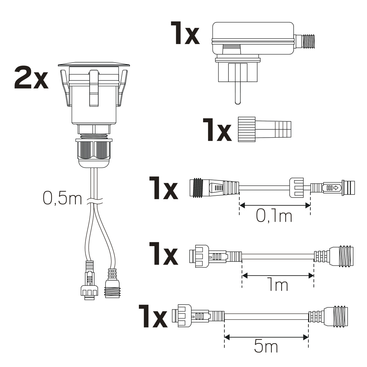 Koristeellinen ja tehokas valaisin terassille, pieni sähkönkulutus. Luomalla ulkovalaistuksella hauskoja tehosteita lisäät myös turvallisuutta talon ympärillä. Mukana 2 kpl 0,5m kumikaapelia ruuviliittimillä. Tarvikkeena saatavana muuntajia ja jatkokaapeli, 1 tai 5 metriä. Voidaan käyttää yhdessä Spotlight Gardenin kanssa yhteisen kytkentäjärjestelmän ansiosta.