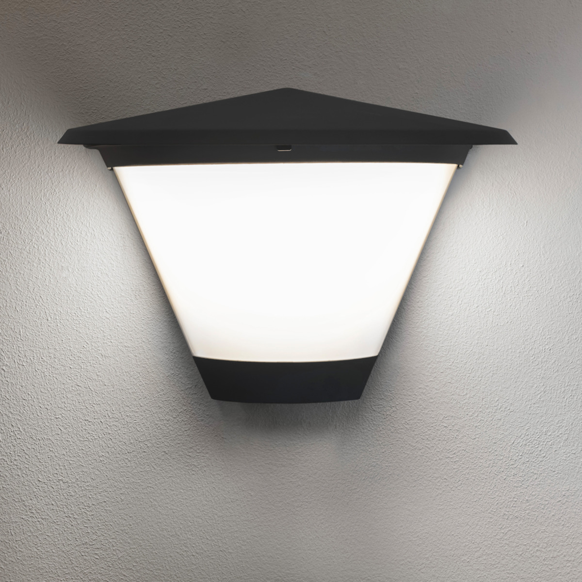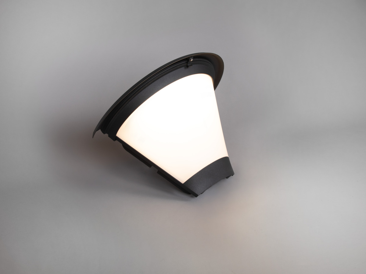 Perinteisesti muotoiltu julkisivuvalaisin, miellyttävän tasainen ja leveä valokuvio seinällä. Valaisimeen on saatavana kaksi integroitua pistorasiaa alapinnalla, mikä on erinomainen ratkaisu puutarhatyövälineille, sähkögrillille tai talviselle koristevalaistukselle. Pistorasioita ja valaistusta voidaan ohjata erikseen. Erittäin helppo asennus erillisen rungon, vähäisten ruuvien ja runsaan tilan ansiosta. Sisäänrakennettu ohjain, DIP-kytkimellä säädettävä valon määrä, 60% ja 100%. Voidaan himmentää ulkoisella ohjaimella, katso käyttöohje.