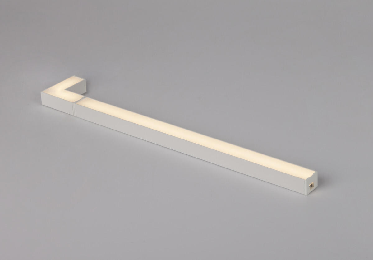 LED-kisko loistavia 90° kulmia varten valkoiseksi maalattua alumiinia, suuri valomäärä ja pisteetön valontuotto. Ihanteellinen vaihtoehto loisteputkille ja alasvaloille kaappien alle. Asennetaan kaksipuolisella teipillä ja ruuveilla tai piilokiinnikkeillä. Voidaan ketjuttaa 4 metriin asti jatkoliittimellä ja/tai ketjutusjohdoilla. Mukana toimitetaan 2 metrin liitäntäjohto, 25cm ketjutusjohto, jatkoliitin ja kiinnikkeet. Kytketään 24VDC LED-muuntajaan. Ketjutettava Touch-himmennin, liitososa, USB-laturi on saatavana tarvikkeena.