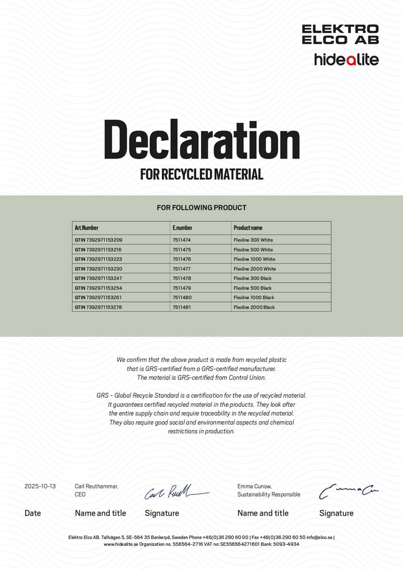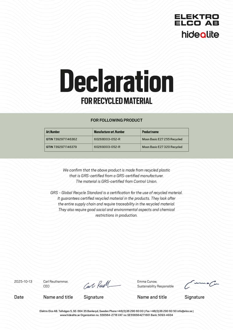 GRS, Global Recycled Standard, on kansainvälinen, vapaaehtoinen standardi, joka varmistaa, että asiakas saa tuotteet, jotka vastaavat ajankohtaisia turvallisuusvaatimuksia ja jonka riippumaton osapuoli on tarkastanut. Sertifiointi kattaa valmistusprosessin kaikki vaiheet ja asettaa vaatimukset kierrätetylle sisällölle, jäljitettävyydelle sekä sosiaalisille ja ympäristöön liittyville menetelmille ja kemikaalirajoituksille.