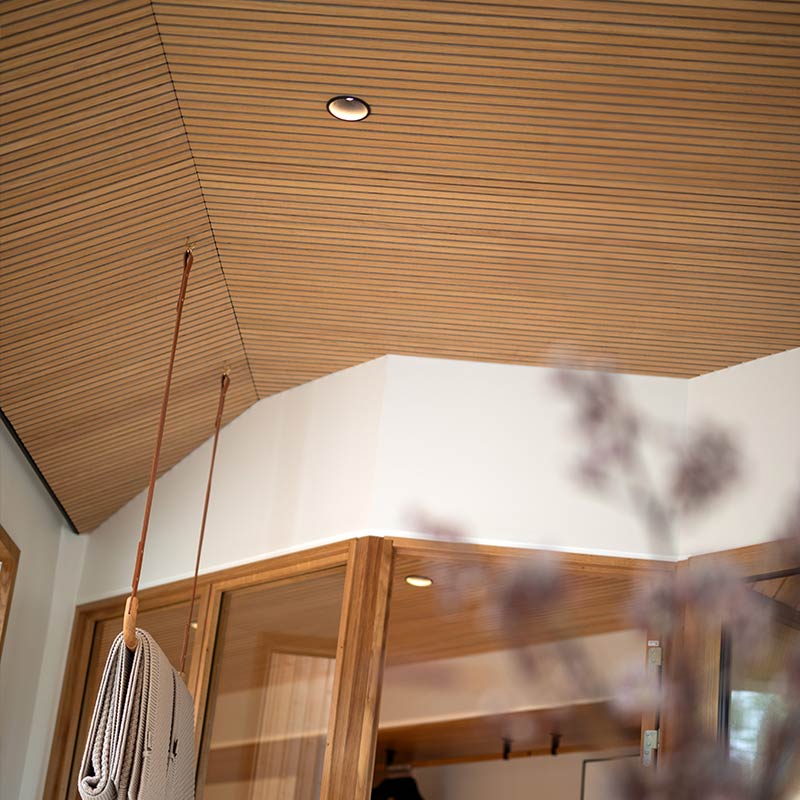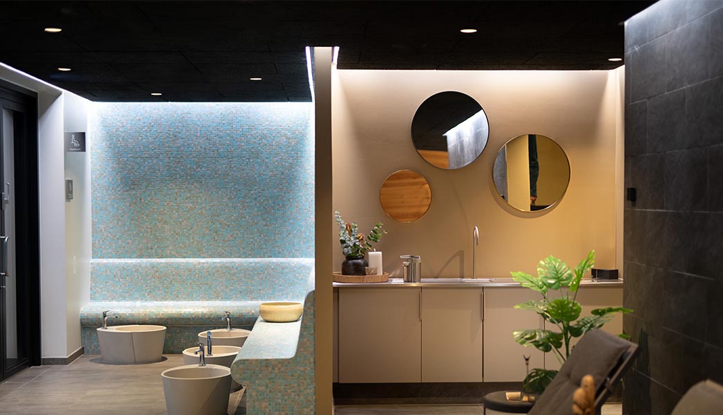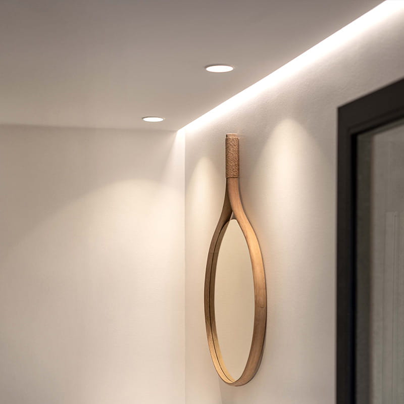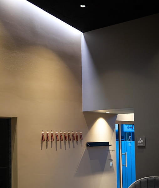 Et besøk på HimmerLands Spa er et øyeblikk hvor tiden står stille. LED-strips montert i profiler langs veggene skaper et mykt og behagelig lys som fungerer både som et stemningsskapende aksentlys og, sammen med de innfelte armaturene i taket, en utmerket generell lyskilde. LED-strips er spesielt nyttige i spa-miljøer for å skape subtile lyseffekter som forbedrer både estetikk og atmosfære.