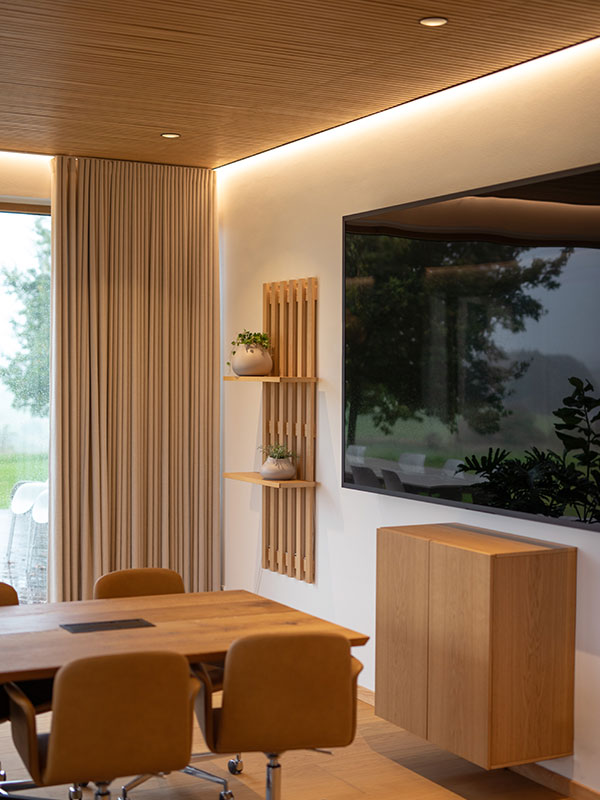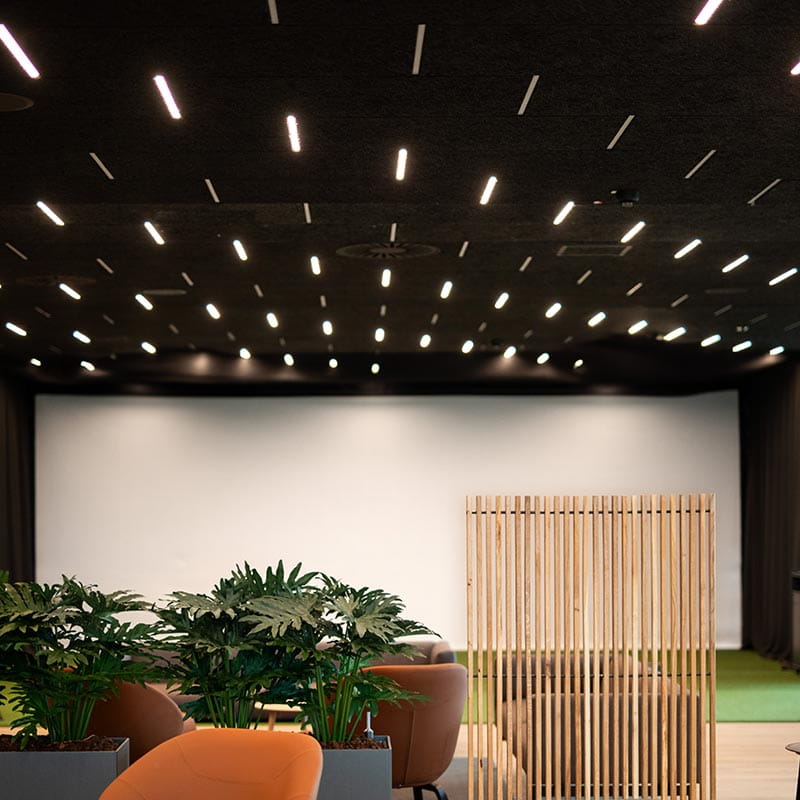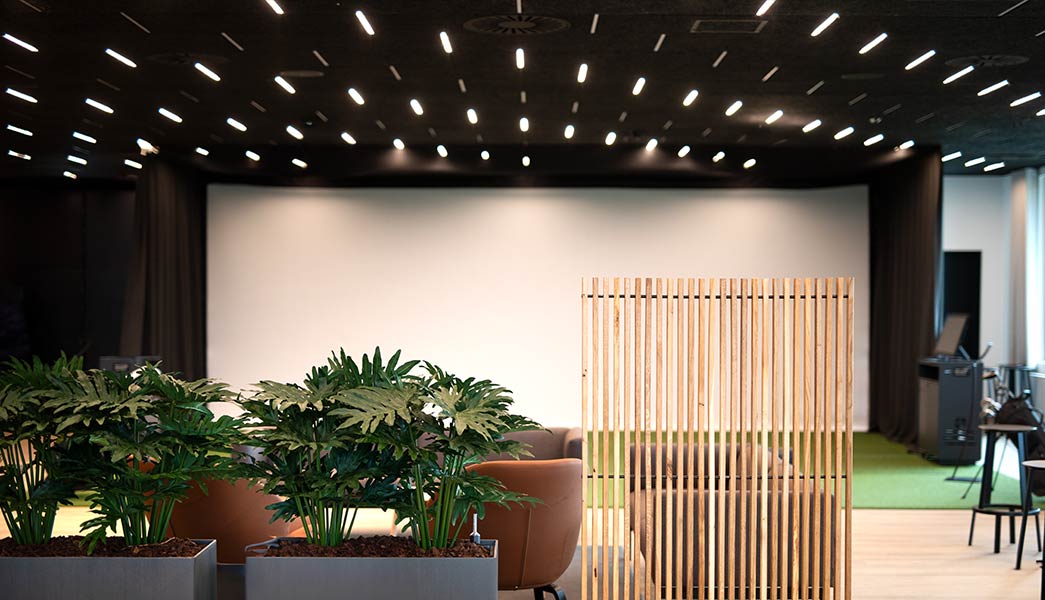 For å holde lysstyrken på et behagelig nivå er LED-strips installert slik at annenhver kan tennes. Dette betyr at lysintensiteten kan justeres etter spillerens ønsker og tid på døgnet, noe som også sikrer at øynene ikke belastes under lengre økter. Full belysning kan også være ideell når du spiller og vil at hvert hjørne av rommet skal være opplyst, perfekt for en intens treningsøkt eller for å fremheve detaljene i rommet under en demonstrasjon eller et arrangement. Å bruke RGBW-farger i et rom med golfsimulator øker gleden ved å spille og bidrar til en mer levende spillopplevelse.