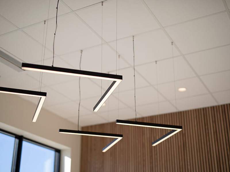 Et stort rektangulært nybygg i svart med rette linjer som gir en følelse av et toppmoderne utseende.Dette er hva vi møtes av litt utenfor sentrum i smålandske Tranås. Logoen kommer til sin grafiske rett på fasaden og er også det første vi ser med store versaler når vi entrer lokalene. Her, over inngangen, henger kundetilpassede svarte V-formede profiler med effektfulle LED-striper i taket som viser tydelig retning videre for besøkende. Produktene er spesifikt tilpasset for å belyse husets hovedinngang.