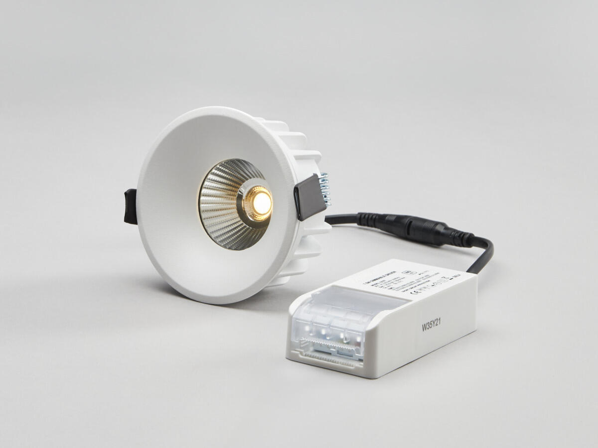 Eksklusiv dekorarmatur i lite format med godt utviklet reflektorteknikk. IInntrukket lyskilde som gir et diskré og godt avblendet lys med svært god fargegjengivelse, Ra > 95. Liten og lavtbyggende – perfekt for nedlektet tak 28 mm med 13 mm gips. Vakker som dekorbelysning alene eller i gruppe. Svart frontring finnes som tilbehør. Komplett med liten fasedimbar driver, hurtigkoblinger for viderekobling og skruefri strekkavlastning for enkel installasjon. Dimbar med de vanligste dimmerne på markedet.