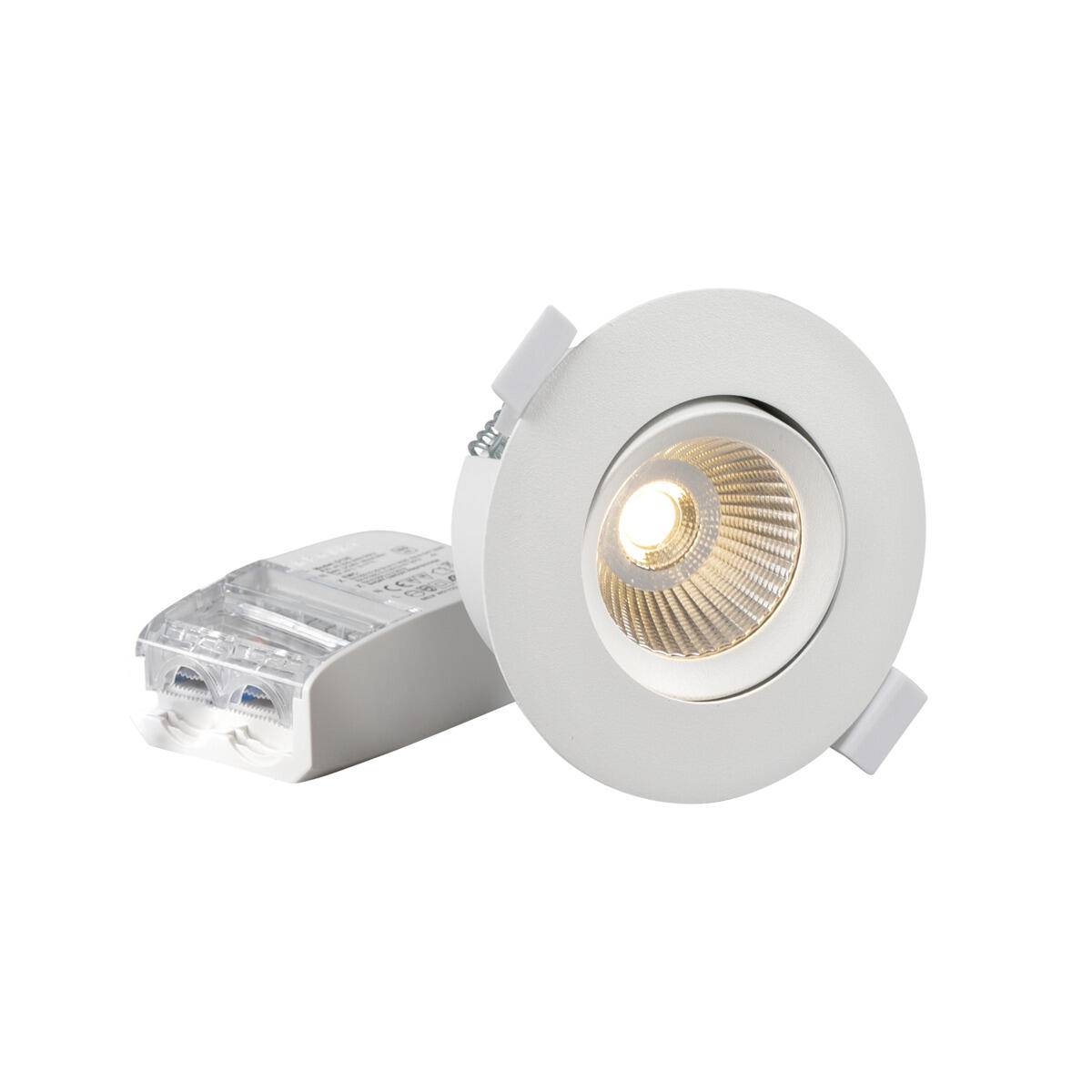 Lavtbyggende, vippbar downlight tilpasset for montering i stendere 28 mm og godkjent for montering direkte mot isolering. Ø 55–63 mm – perfekt erstatning for gamle halogenarmaturer ved rehab-arbeid. Reflektorteknikk, godt avblendet lysbilde med svært god fargegjengivelse, Ra>95. IP44-utførelse for montering inne og ute. Fasedimbar driver for enkel tilkobling til 230 V, 3-polet hurtigtilkobling for viderekobling og skruefri strekkavlastning for kabel. Dimbar med de vanligste dimmerne på markedet.