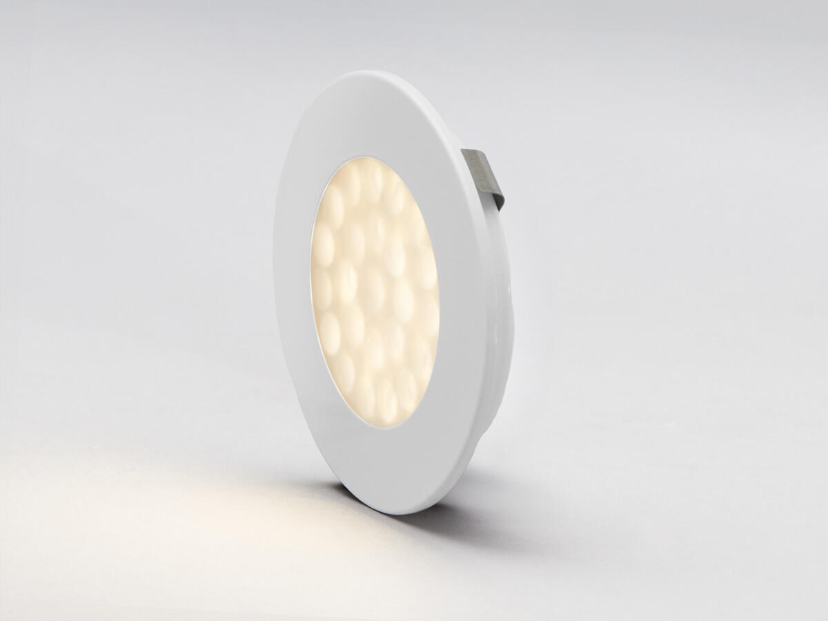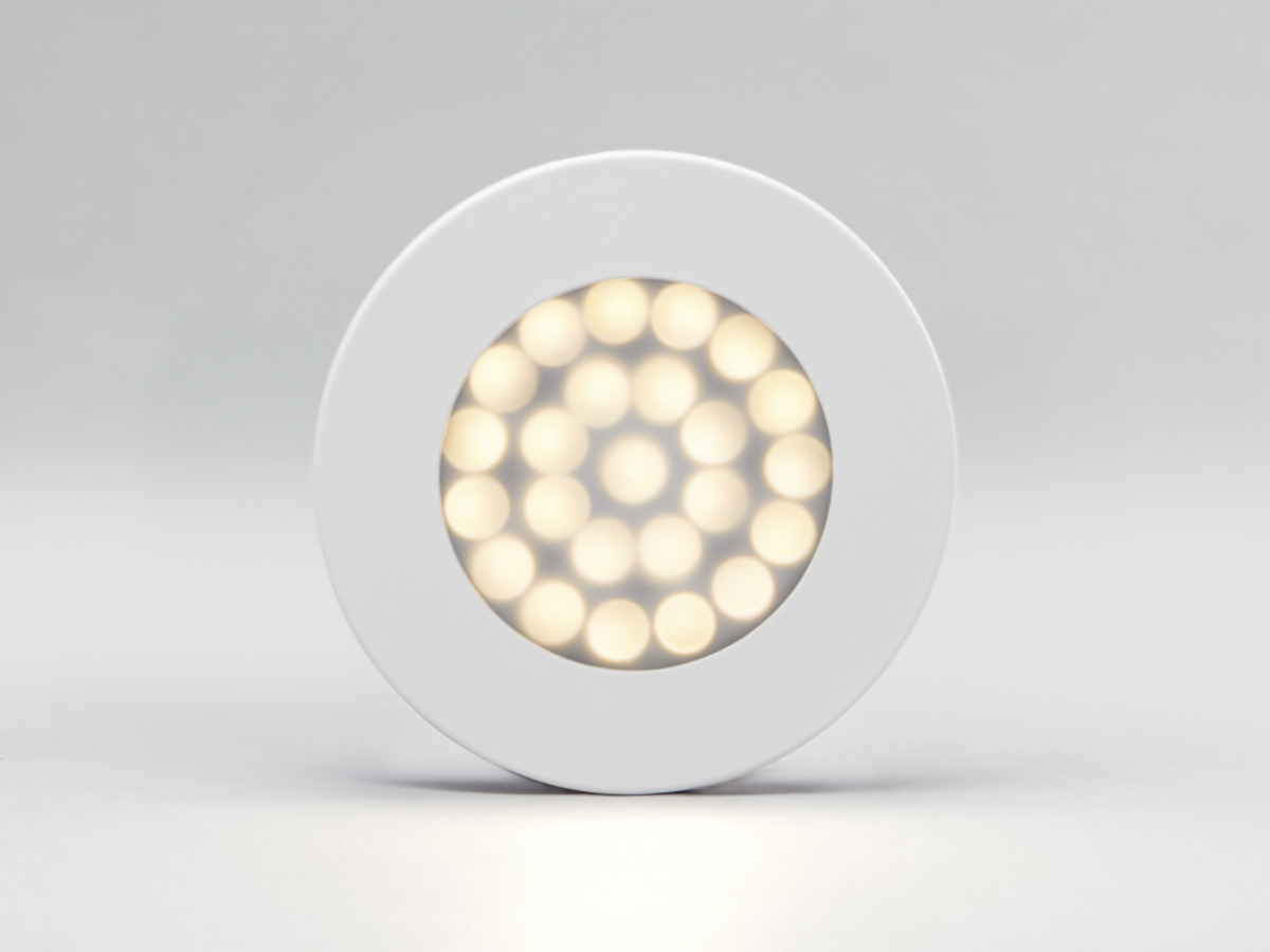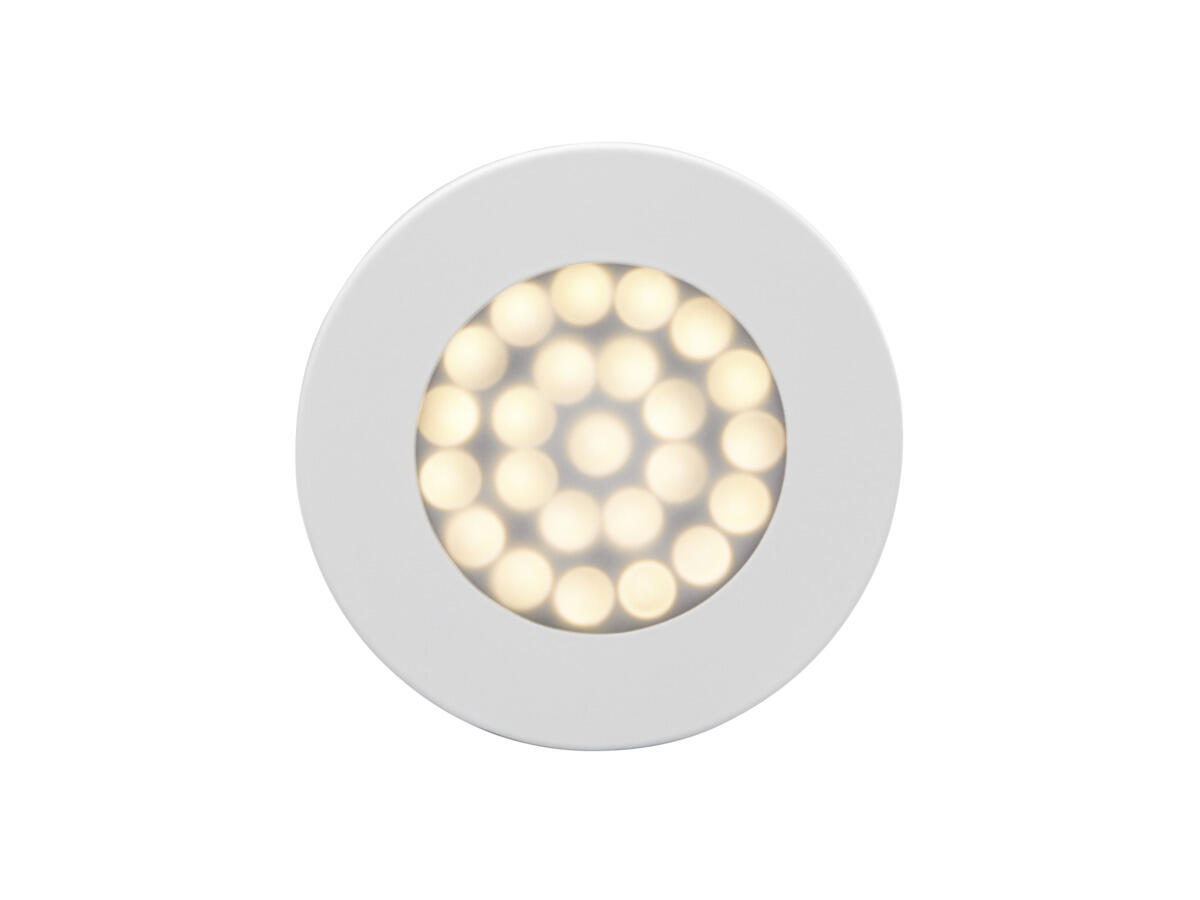LED-armatur med en innbyggingsdybde på bare 9 mm, perfekt til skapbelysning og under hyller på kjøkken og bad. Energieffektiv LED-lyskilde på 2W med 55° lysspredning. Erstatter tilsvarende 10W halogenspoter med en energibesparelse på 80%. Armaturhus i aluminium. Leveres med 2m kabel med hurtigkontakt og kobles til LED-trafo 12V DC via parallellkobling. Kan lysreguleres med LED-dimmer. Avstandsring for utenpåliggende montering finnes som tilbehør.