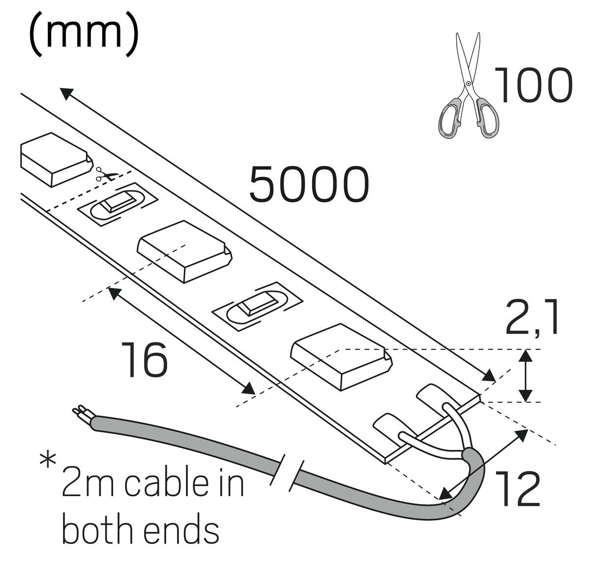 Toppbøyd LEDstrip i IP67-utførelse, kan fås i lange lengder med tilbehør som du enkelt monterer selv. Fleksibelt silikonhus av høy kvalitet som gir en sterk og holdbar beskyttelse. Homogent prikkfritt lys uten tilbehør. Leveres i ruller på 5 m med 3 m tilkoblingskabel i en ende, 15 stk. klips, skrue, 1 stk. endedeksel, 1 stk. endetilkobling for kabel for rask og enkel installasjon. Kan målbestilles i ønskede lengder opp til 17 m (RGB 13 m). På forespørsel leveres løpemeter med tilkoblingskabel etter ønske, standardleveranse av løpemeter skjer uten tilkoblingskabel. Kobles til 24 VDC, driver bestilles separat.