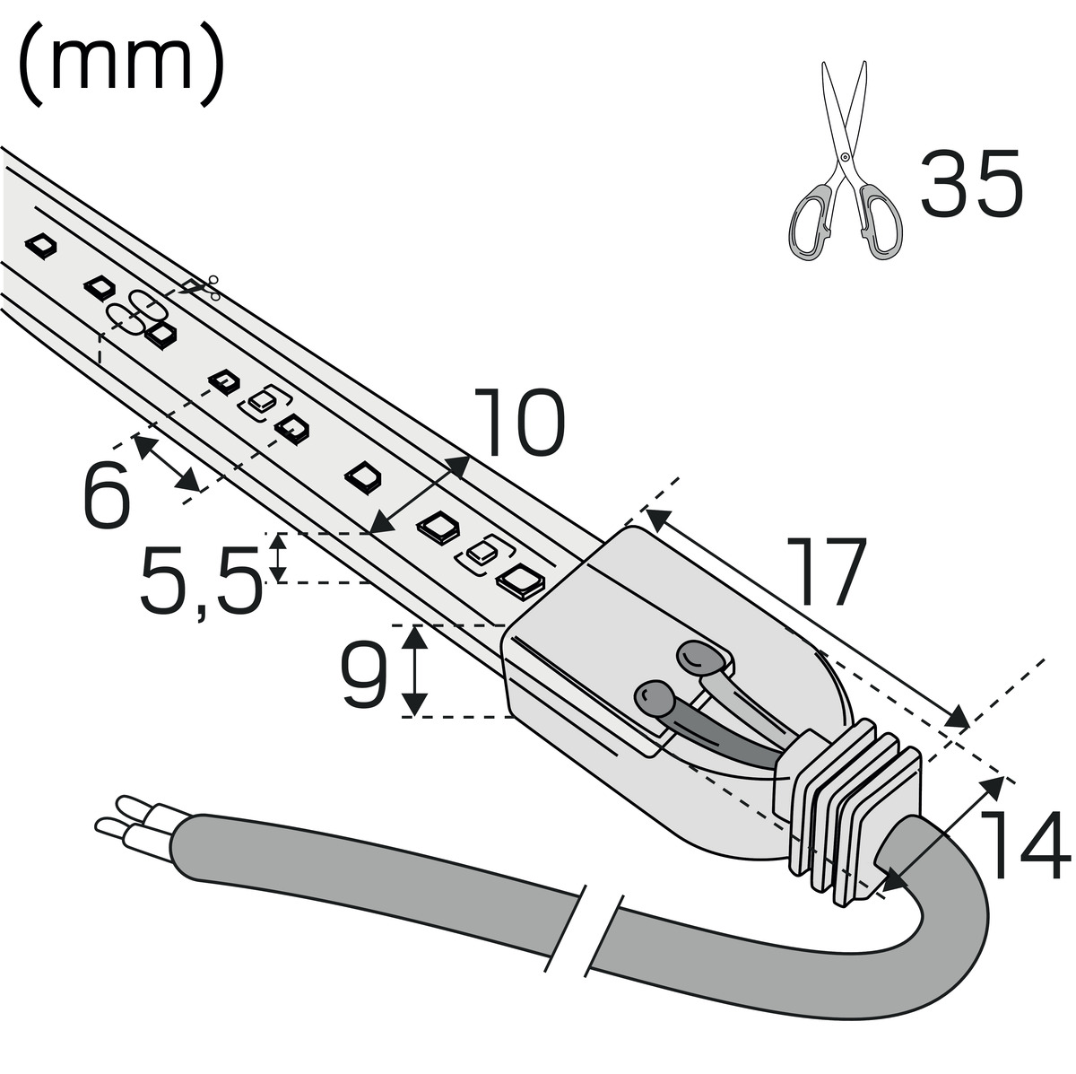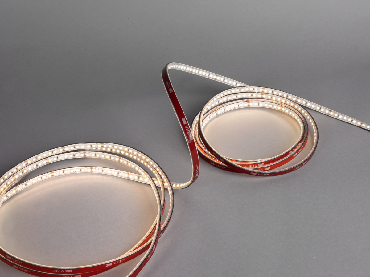 LEDstrip med innkapslet opalfarget hus av silikon som skaper en jevnt lysende linje uten profil og dekklokk. COB-teknologi med kort avstand mellom diodene gir svært god effektivitet. Kort kappeintervall på 30 mm og sømløs skjøting gjør det enkelt å lage tilpassede lengder. Leveres som standard i ruller på 5 m med 2 m tilkoblingskabel i hver ende, 2 stk. endeavslutninger, selvklebende tape for enkel montering. På forespørsel leveres løpemeter med tilkoblingskabel etter ønske, standardleveranse av løpemeter skjer uten tilkoblingskabel. Driver bestilles separat etter ønsket dimmeteknologi og plassering. Maks. lengde 5 m.