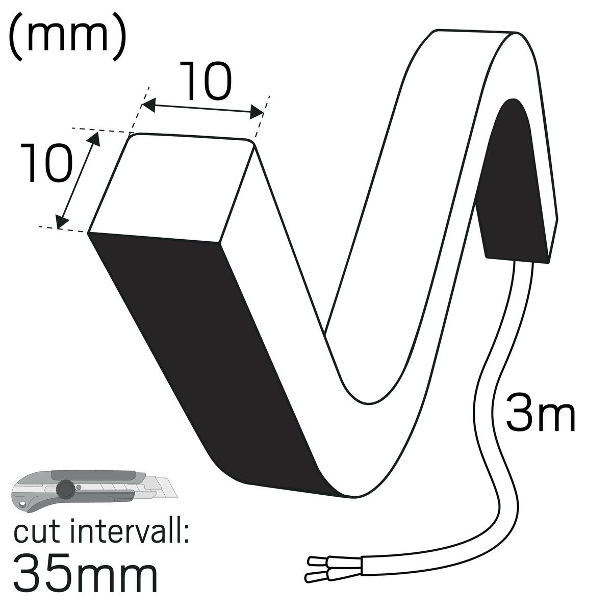 Toppbøyd LEDstrip i IP67-utførelse, kan fås i lange lengder med tilbehør som du enkelt monterer selv. Fleksibelt silikonhus av høy kvalitet som gir en sterk og holdbar beskyttelse. Homogent prikkfritt lys uten tilbehør. Leveres i ruller på 5 m med 3 m tilkoblingskabel i en ende, 15 stk. klips, skrue, 1 stk. endedeksel, 1 stk. endetilkobling for kabel for rask og enkel installasjon. Kan målbestilles i ønskede lengder opp til 17 m (RGB 13 m). På forespørsel leveres løpemeter med tilkoblingskabel etter ønske, standardleveranse av løpemeter skjer uten tilkoblingskabel. Kobles til 24 VDC, driver bestilles separat.