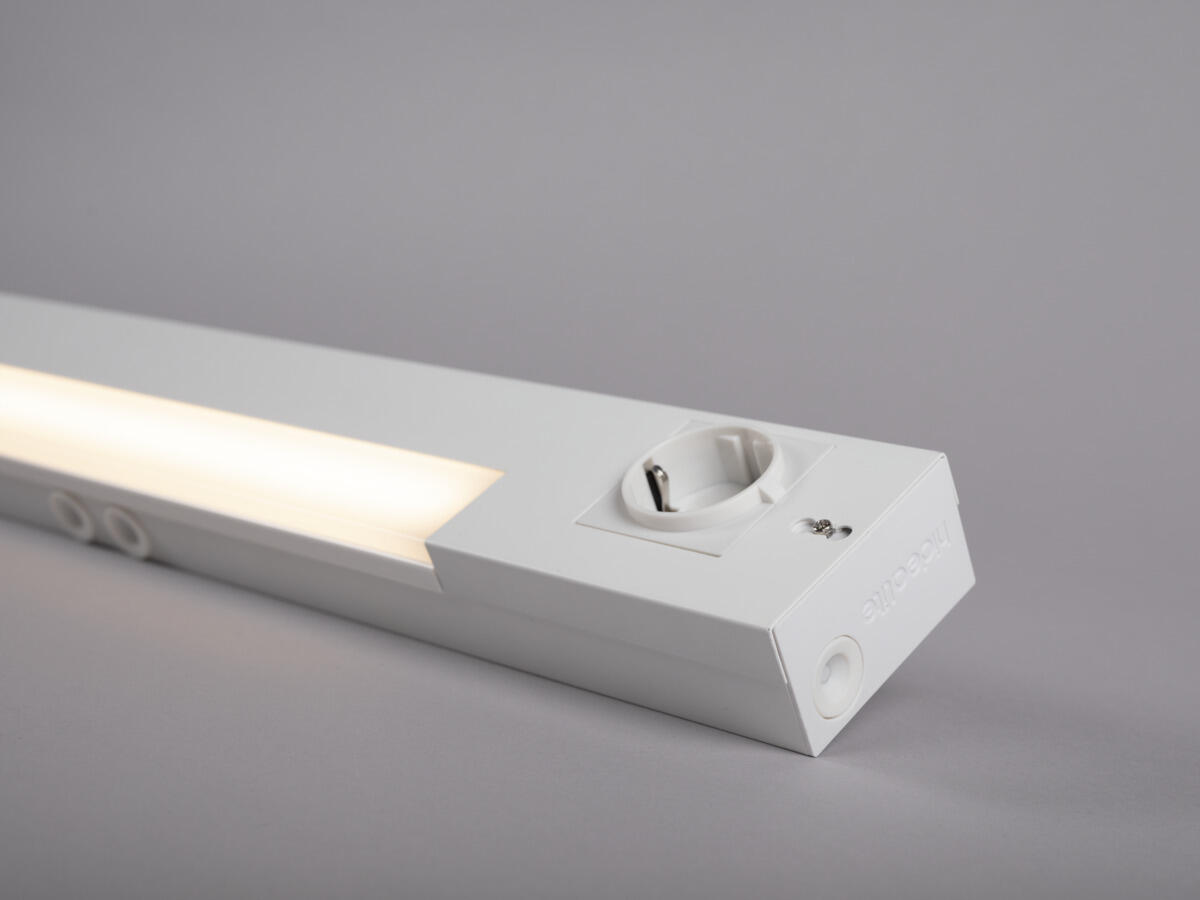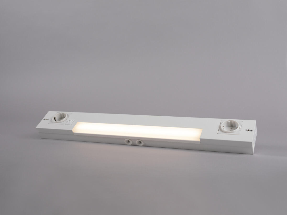 Dimbar overskapsarmatur med lineært lys i tre lengder og uttak i hver side. Perfekt erstatter for lysrørarmaturer eller ved ny-installasjon. Opalt lysutslipp i to retninger, gir lys på både arbeidsflate og vegg. Valgbar fargetemperatur via DIP-switch ColourTemp. On/Off-bryter på armatur, kan dimmes med ekstern dimmer. Enkel installasjon med skrue, god plass, nøkkelhullsmontering samt kabelgjennomføring på både kort- og langside. Belysning og uttak kan styres separat.