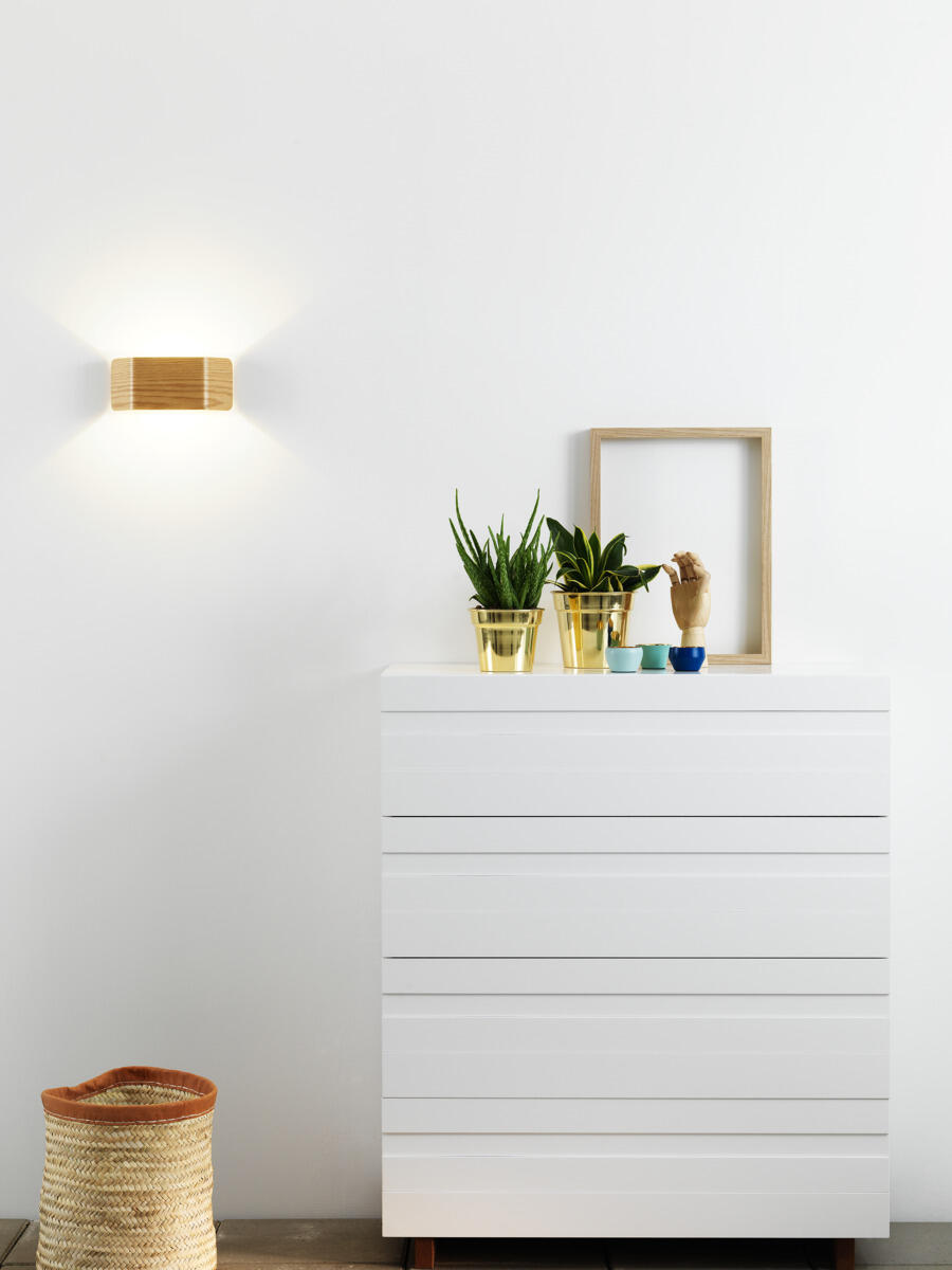 Moderne LED-armatur i retrostil med behagelig indirekte opp- og nedlys som gir et dekorativt lysbilde på veggen. Passer utmerket som effektbelysning i både privat og offentlig miljø. Utførelse i trefanér eller hvitlakkert aluminium. Leveres komplett med innebygd dimbar driver. Kan dimmes med de vanligste dimmerne på markedet.