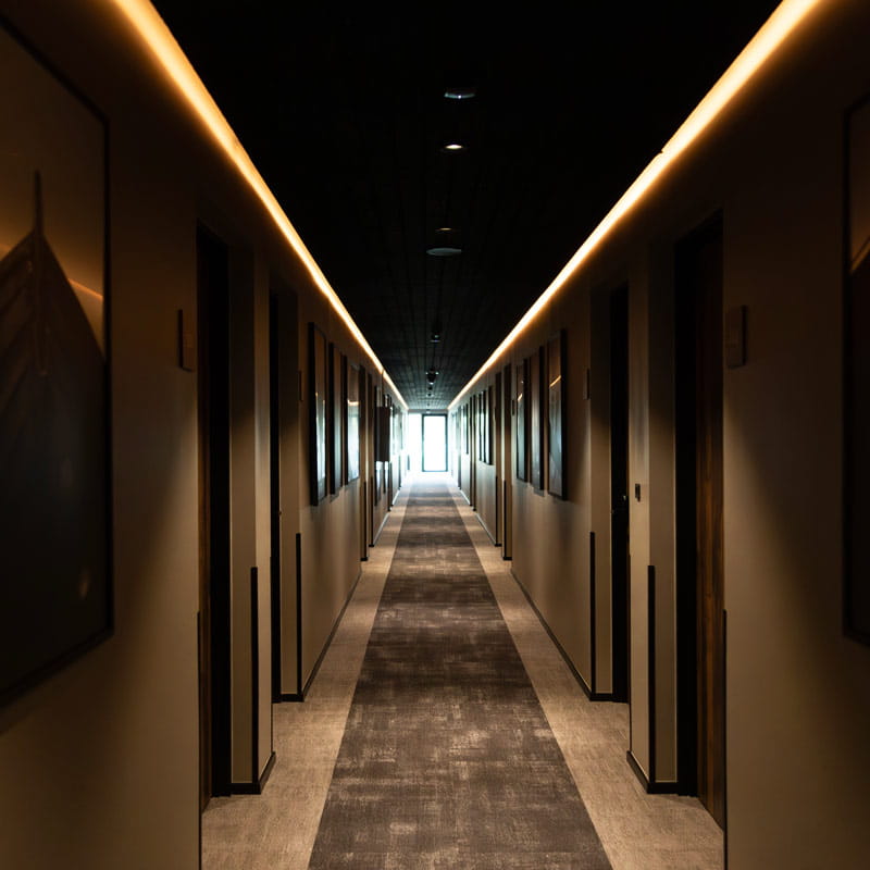 Ett hotell har till uppgift att skapa alltifrån en tillfällig oas för den som är på affärsresan till att ge en avkopplande upplevelse för familjen som planerat en getaway weekend. Självklart påverkas alla typer av hotellvistelser av belysningen, som tillsammans med övrig inredning skapar helhetsupplevelsen för besöket. Belysningslösningar med tracklights gör det både möjligt att skapa allmänbelysning och accentbelysning genom att rikta ljuset på något specifikt som ska framhävas i rummet.