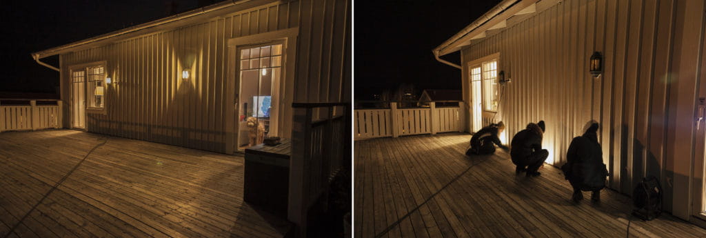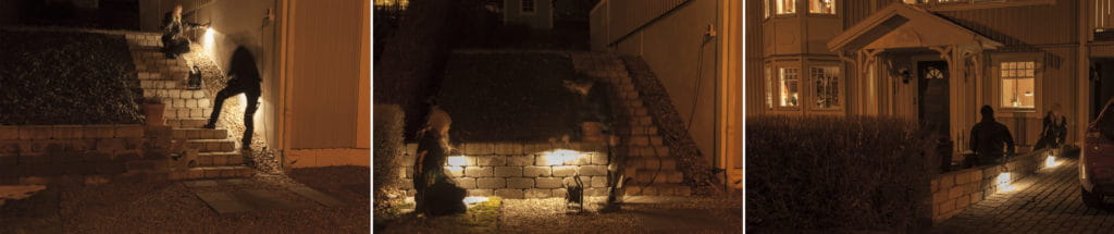 I skissen hade vi även en del dekorativ belysning på husets framsida. Under provbelysningen märkte vi att man kunde komplettera med belysning både på husvägg och trappan intill. Även här jobbar funktionell belysning tillsammans med dekorativ.