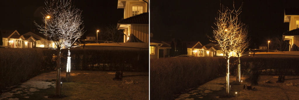 Tips! Välj spottar på markspett och lägg kabeln ovan mark. På så sätt har du möjlighet att flytta och anpassa belysningen efter vilka träd/buskar som är fina att belysa beroende på årstid. Möjligheterna är oändliga!