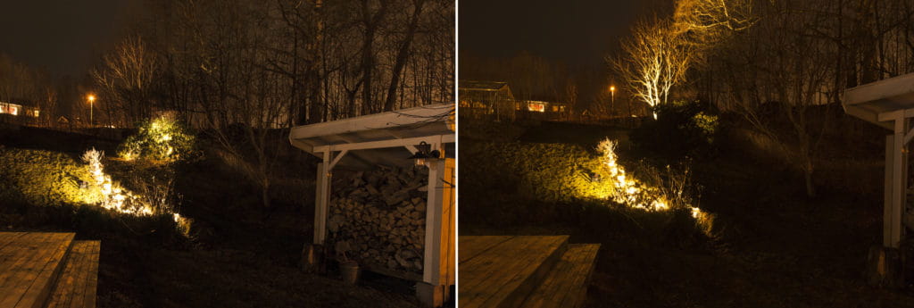 I förra inlägget skrev vi om dekorativ och funktionell belysning. I vår första skiss var planen att belysa enligt bilden till vänster. Under provbelysningen upplevdes det något rörigt och det skapades stora kontraster mot den bakre delen av trädgården, som upplevdes mörk och svårorienterad. Linda, vår ljusdesigner, valde då att istället belysa kastanjeträdet längre bak i trädgården, och på så sätt få en funktionell belysning (få förståelse över var trädgården slutar ) och en dekorativ belysning (se bild till höger).