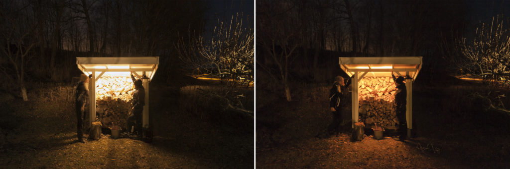 På bilderna kan man tydligt se hur ljusfärg och material samverkar. Genom att belysa upp trä med en varmare ljusfärg förstärker man träets egna färg (bild till höger), medan en kallare färg inte alls ger samma känsla (bild till vänster).