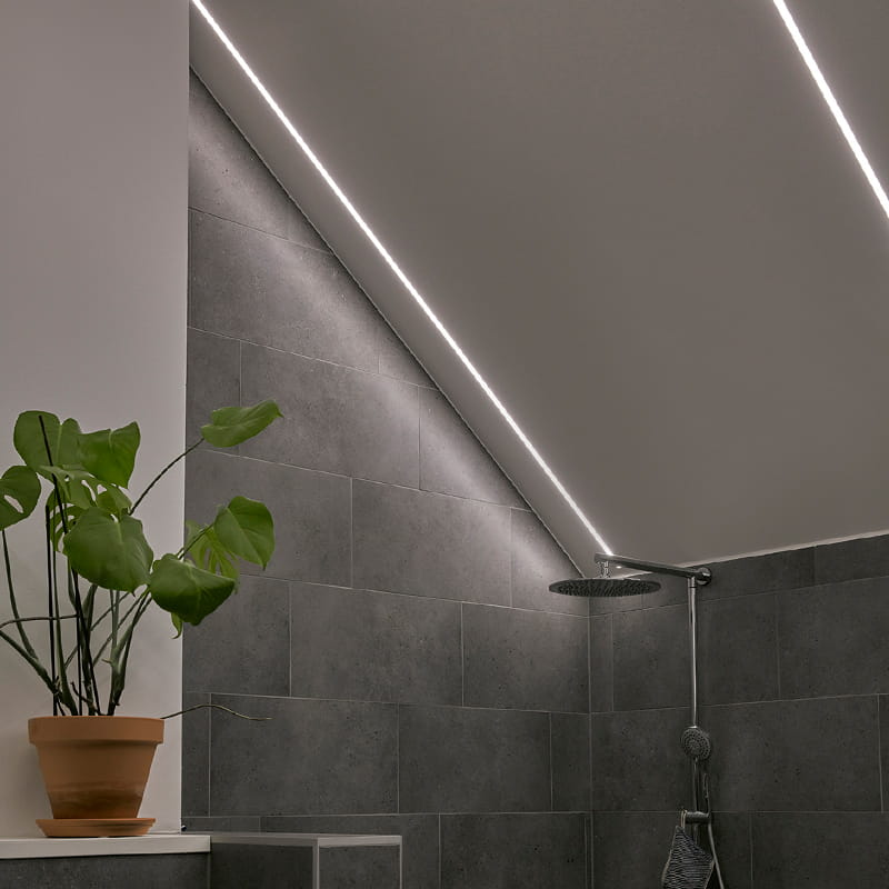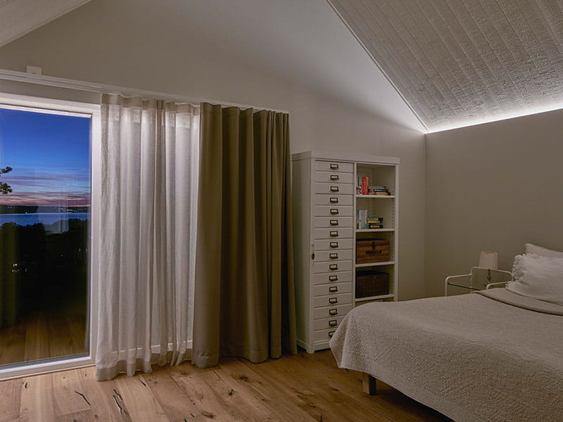 Vi går upp till övervåningen och in i Master Bedroom. Här syns LEDstrip RX IP20 monterad i Profil-U hög i sovrumsfönstret. LEDstrippen som lyser upp ryggåstaket i till höger sitter också monterad i Profil-U hög med ett opalt täcklock och sprider ett jämnt släpljus.
