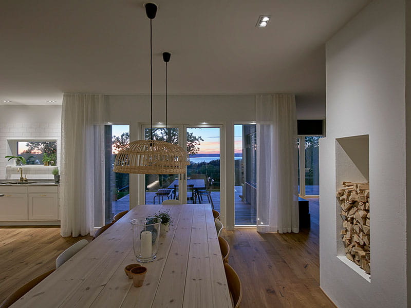 Ställer vi oss under trappan och tittar åt andra hållet ser vi Jonas egengjorda matbord som en samlingsplats mellan kök och vardagsrum. Här lyser Bright Eye G2 Box II upp vedhögen intill kaminen till höger i bild. Samma belysning sitter inne i köket till vänster som arbetsbelysning. Återigen Core Smart 15° i fönstersmygen. Härlig Vätterutsikt!