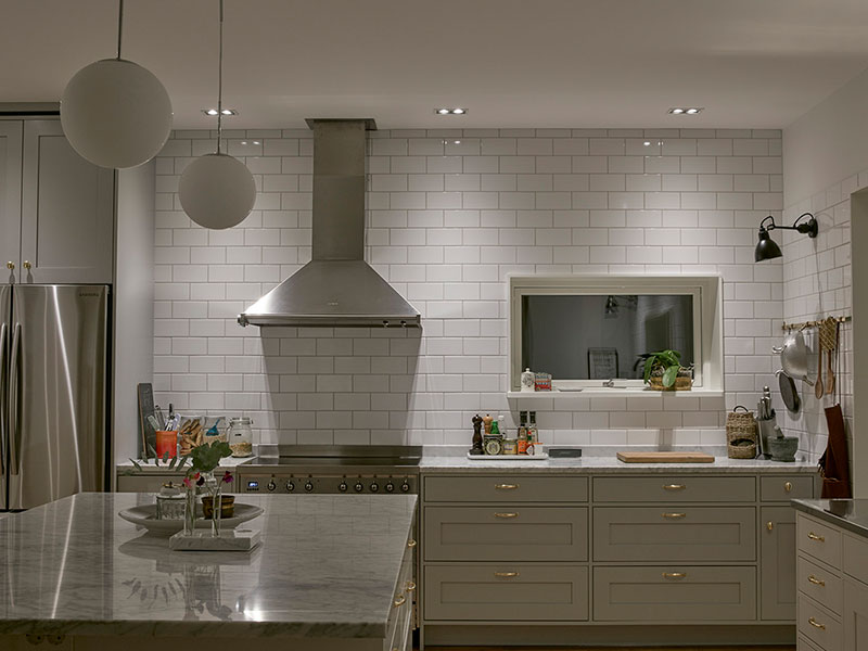 Framför kyl, frys och högskåp är det en fördel att ha downlights i taket som ger ett bra ljus in i skåpen. I ett större kök kan du komplettera med downlights i gångar eller öppna ytor.
