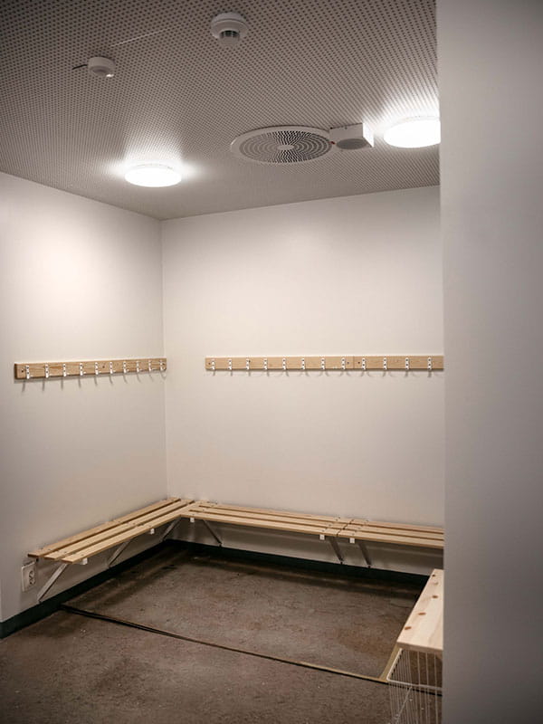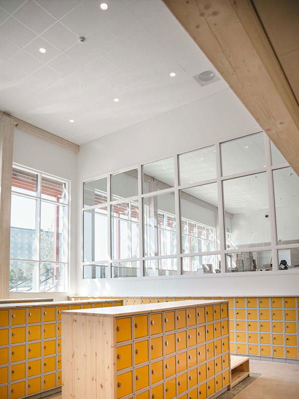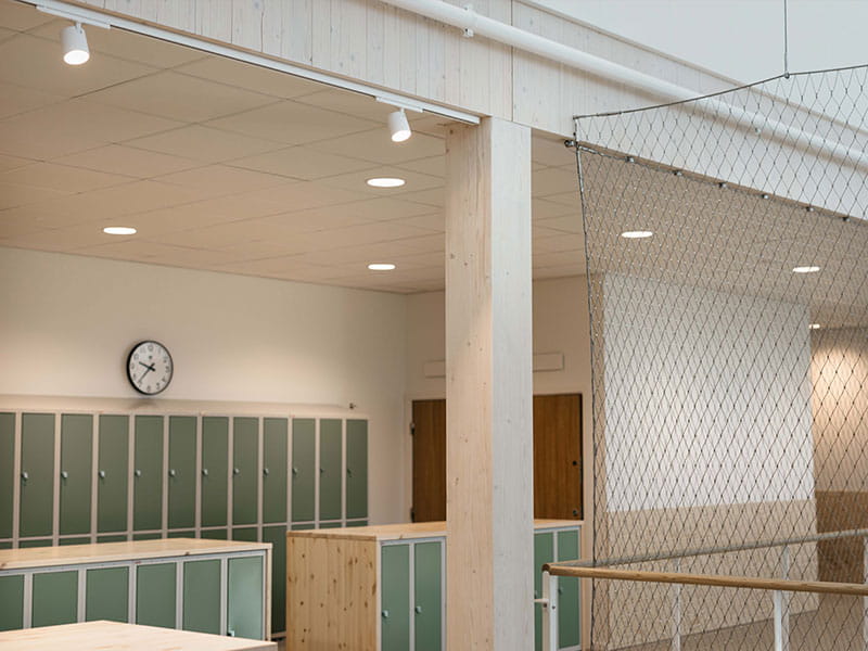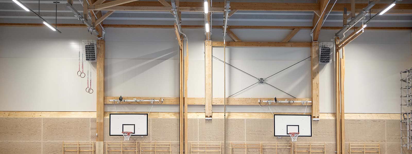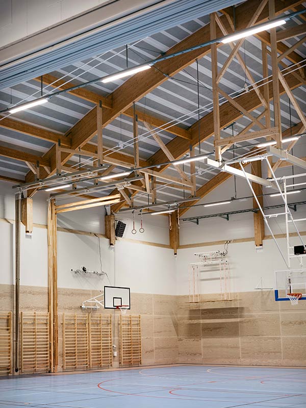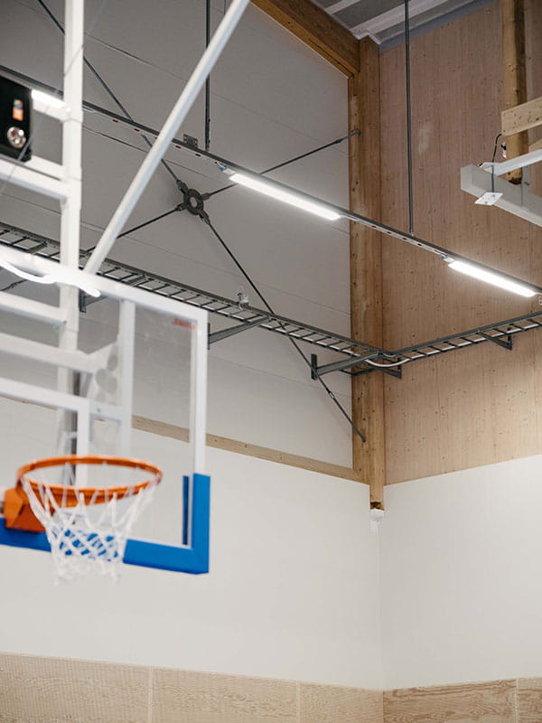 Ljuset i sporthallen är ett kapitel för sig. Den helt nya hallen är en imponerande del av skolmiljön, med generösa ytor och en pampig träkonstruktion som ramar in läktare och spelplan. Här handlar det om att få till både ljusstyrka, jämn ljusfördelning och säkerhet. Hallens tak är utrustat med Indline G2 IP23 Sport, en bolltestad armatur med skyddsgaller, asymmetrisk ljusbild och hög effektivitet. Enkel att installera och underhålla. I de intilliggande skyddsrummen sitter Liteline Basic IP44 med skyddsrumsbygel, ett pålitligt val där det krävs extra tålighet.