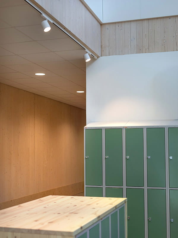 Korridorerna är ljusa och avskalade, med väggar i trä och gröna elevskåp längs sidorna. Här har vi valt Echo L, en kraftfull infälld downlight som ger ett högt ljusflöde, passar utmärkt i ytor med lite högre tak och levererar ett jämnt och behagligt ljus genom hela passagen. Den fungerar både vid nyinstallation och som ersättare till äldre kompaktlysrör.