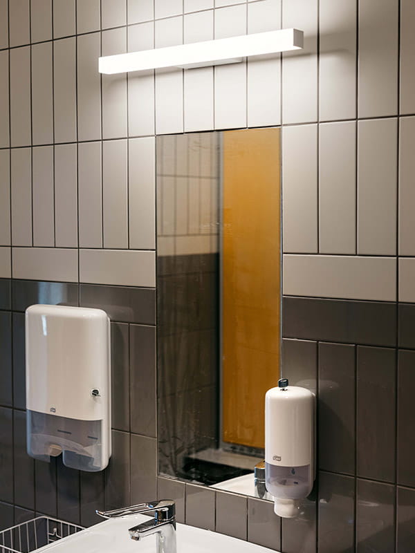 Inne på toaletterna sitter Moon Slim med integrerad PIR-sensor som tänds direkt när dörren öppnas. På flera av toaletterna sitter Mirro IP44 monterad, en tidlös spegelarmatur anpassad för att klara kraven för mindre badrum i offentlig miljö.