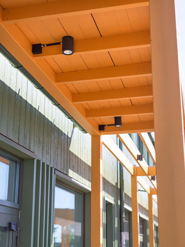 Längs skolans fasad löper ett gångstråk under en serie stående spjälkonstruktioner som bildar en längre pergola. Här sitter Milo XL Down dikt tak. En IP55-klassad armatur med reflektorteknik, högt ljusflöde och slitstark finish. Den ger ett tydligt och tryggt ljus för elever och personal som rör sig mellan byggnaderna.