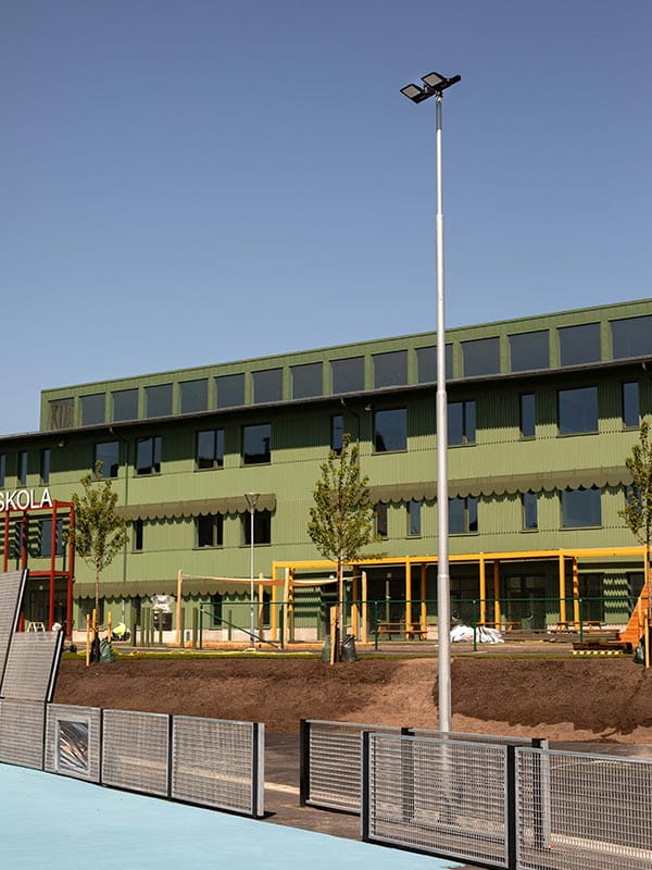 Ute på skolområdet fortsätter ljuset att skapa trygghet. Runt multisportplanen har strålkastare Scout G2 M monterats i topp på stolpar. Med asymmetrisk ljusbild och högt ljusutbyte lyser den effektivt upp hela ytan utan att blända. Armaturen är byggd för att klara nordiska förhållanden och kan anpassas efter olika höjder och vinklar.