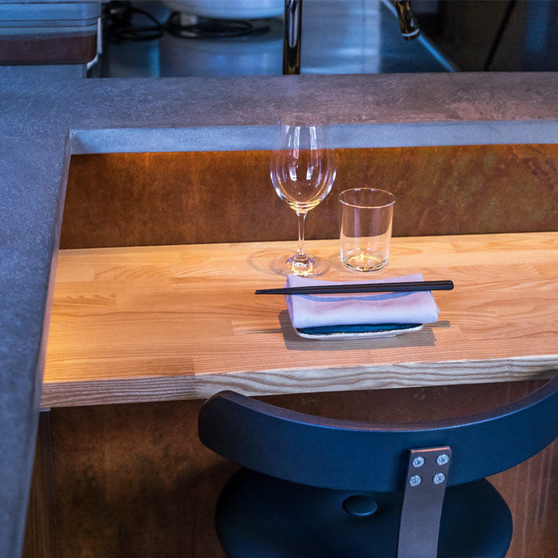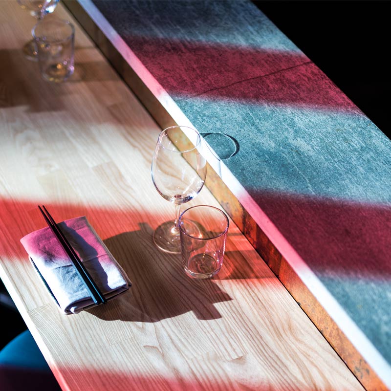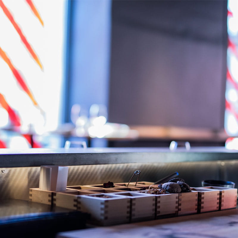 Hos Izakaya Moshi står alltid lyxiga och enkla, vällagade, japanska smårätter i centrum. Restaurangens inredning av dova och mörka färger med knallröda detaljer skapar en spännande och modern oas som förstärks av en genomtänkt och snyggt integrerad belysning.