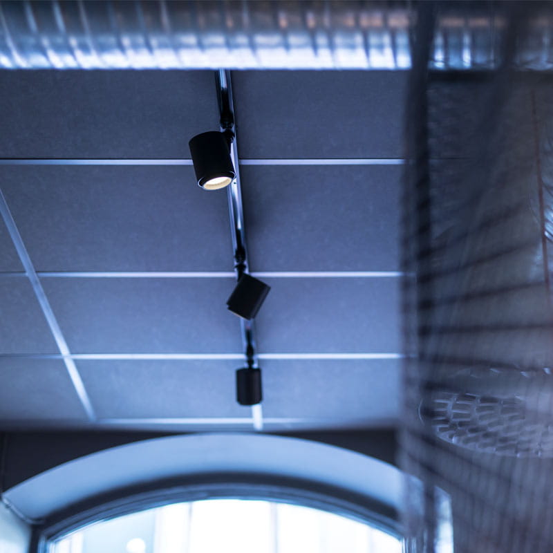 Till det allmänna ljuset föreslog vi svarta Focus Track Mini som matchar och smälter in med det svarta taket. Armaturen är stilren och väl avbländad som fungerar perfekt både som accentbelysning och allmänljus. Belysningen går att rikta i olika lägen för att lyfta fram detaljer, samt dimra för att justera ljusflödet och stämningen.