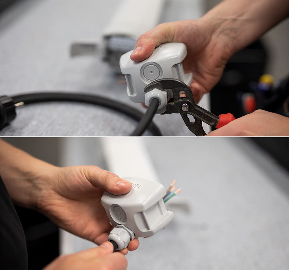 Anpassningarna som gjordes i detta projektet var montage av ett 2m sladdställ (hona/hane) åt vardera håll. Vilket både underlättade vid installationen och gjorde att kunden enkelt kunde ändra placering vid behov