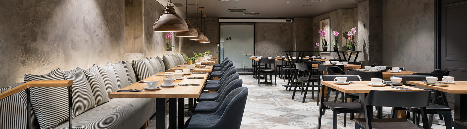 Exempelvis lackades Optic Deep i hotellets restaurangutrymmen av Hide-a-lite för att möta arkitektens önskan om att armaturen skulle passa på bästa möjliga sätt i hotellomgivningen - nu skapar de svarta downlightsen en intressant detalj i restaurangens tak.