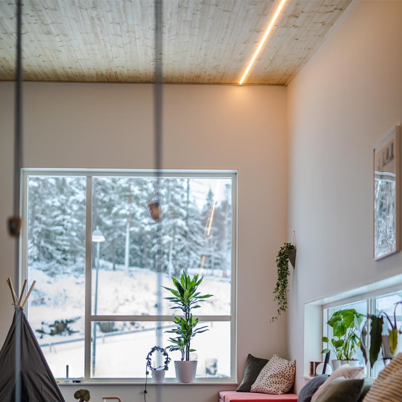 I vardagsrummet valde vi istället en varmare färgtemperatur för att skapa ett mer ombonat och mysigt ljus. Här använde vi Profil Lean som monterades mellan takpanelerna.