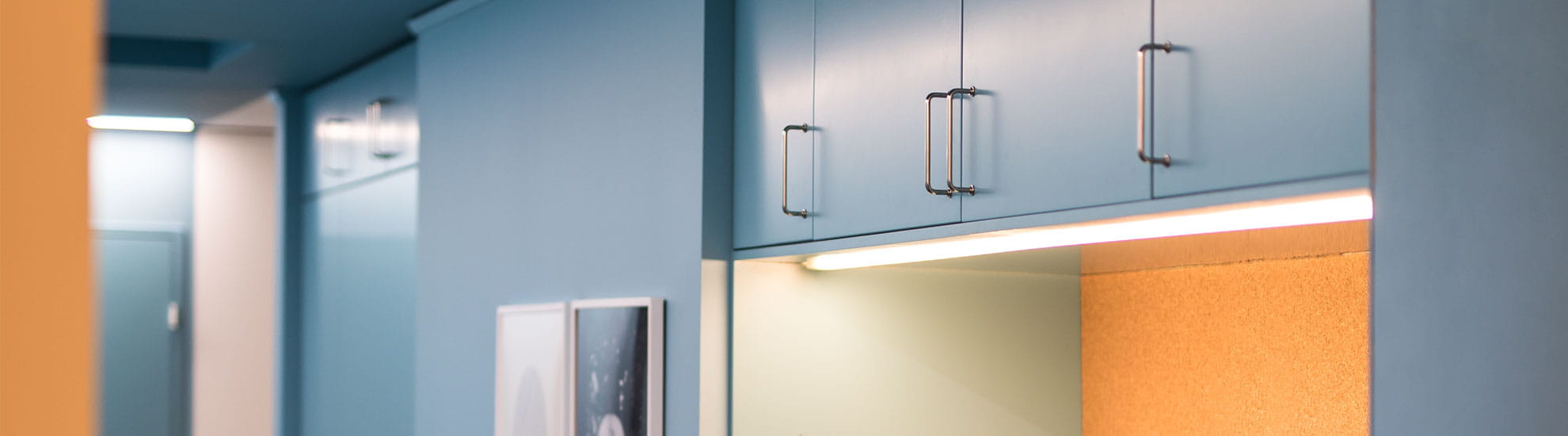 Unikt för det här projektet är alltså att vi enbart har använt olika LEDstrips, framförallt LEDstrip TW, för att skapa ett unikt hem och kunna anpassa färgtemperaturerna efter omgivningen och de olika kulörerna i huset. Vanligtvis brukar vi rekommendera att använda samma färgtemperatur i ett hem, men i det här fallet ville vi framhäva de existerande kulörerna på bästa vis. I hallen möts man av en turkos färg på väggarna och för att lyfta fram kulören använde vi en färgtemperatur på 6500K. Det kalla ljuset förstärker den blåa väggfärgen och skapar ett häftigt sken.