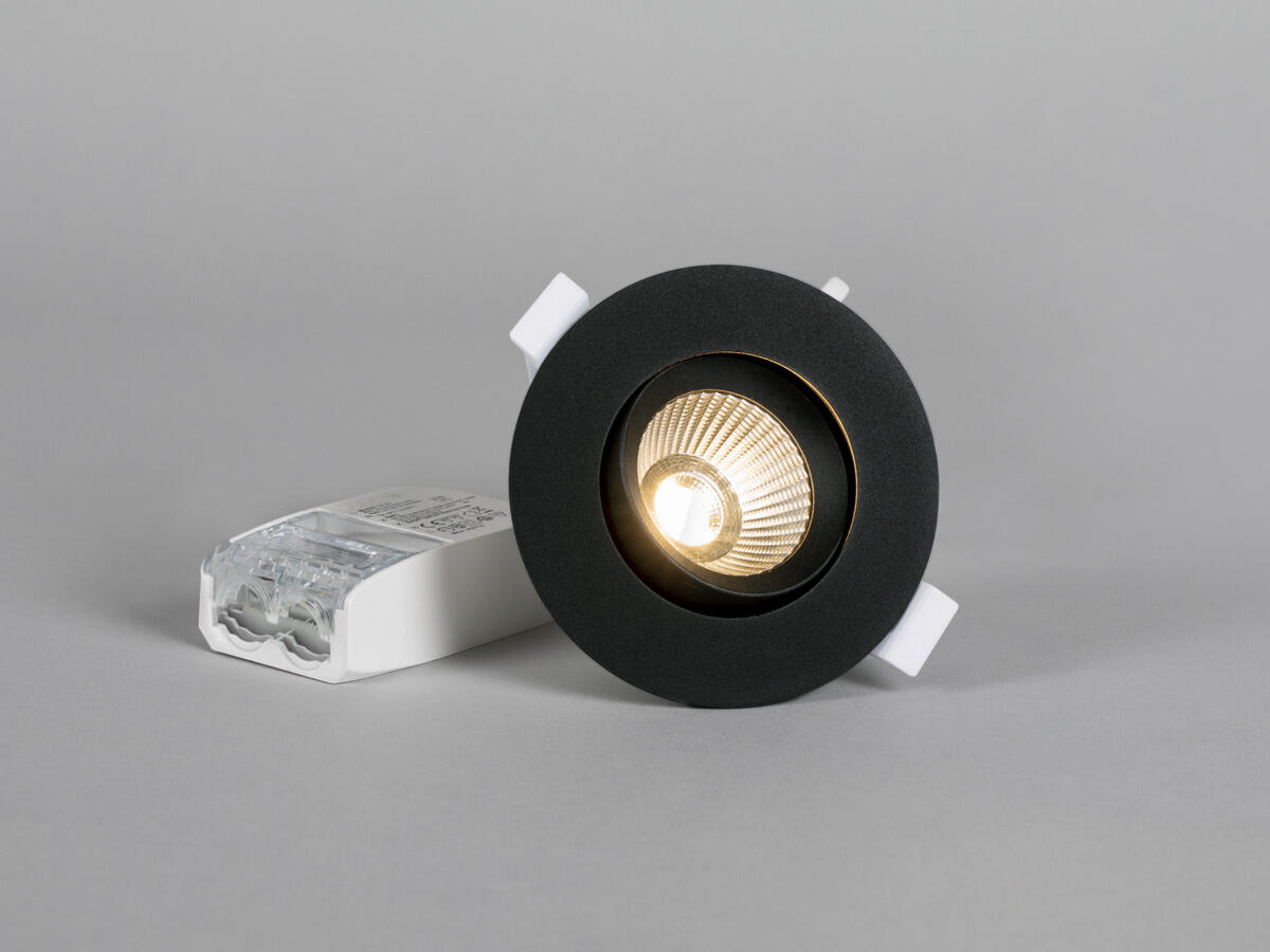 Lågbyggande, tiltbar downlight anpassad för montage i glespanel 28mm och godkänd för montage direkt mot isolering. Håltagning mellan 55-63mm – perfekt ersättare för gamla halogenarmaturer vid ROT-arbeten. Reflektorteknik, väl avbländad ljusbild och mycket god färgåtergivning, Ra>95. IP44-utförande för montage inne och ute. Fasdimringsbart drivdon för enkel 230V-anslutning, 3-polig snabbplint för vidarekoppling och skruvfri dragavlastning för kabel. Dimbar med de vanligaste dimrarna på marknaden. .