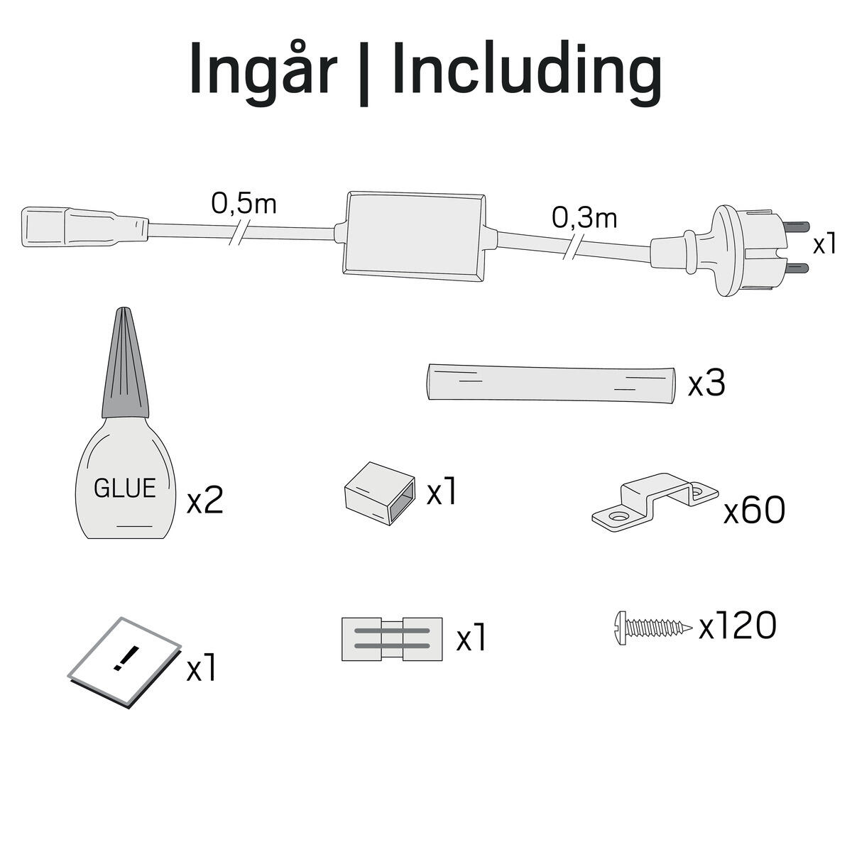 • 10m levereras med förmonterat sladdställ (80cm) med jordad stickontakt och fasdimringsbar DC-konverter, clips och skarv