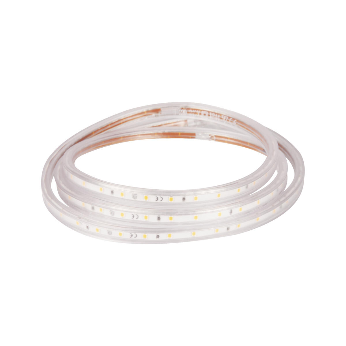 Fasdimringsbar 230V LEDstrip i IP44-utförande för belysning utomhus. Högt ljusflöde och mycket god färgåtergivning, Ra>90. För effektfull och dold belysning t.ex. som uppljus på takbjälkar, under takfoten eller i ett räcke. Standard i rullar på 10 meter med monterat sladdställ (80cm), jordad stickpropp och fasdimringsbar DC-konverter, clips och skarv för en enkel installation. På förfrågan levereras löpmeter med anslutningskabel enligt önskemål, löpmeter levereras som standard utan anslutningskabel. Kan måttbeställas i längder upp till 50m, kapning per 1 meter.