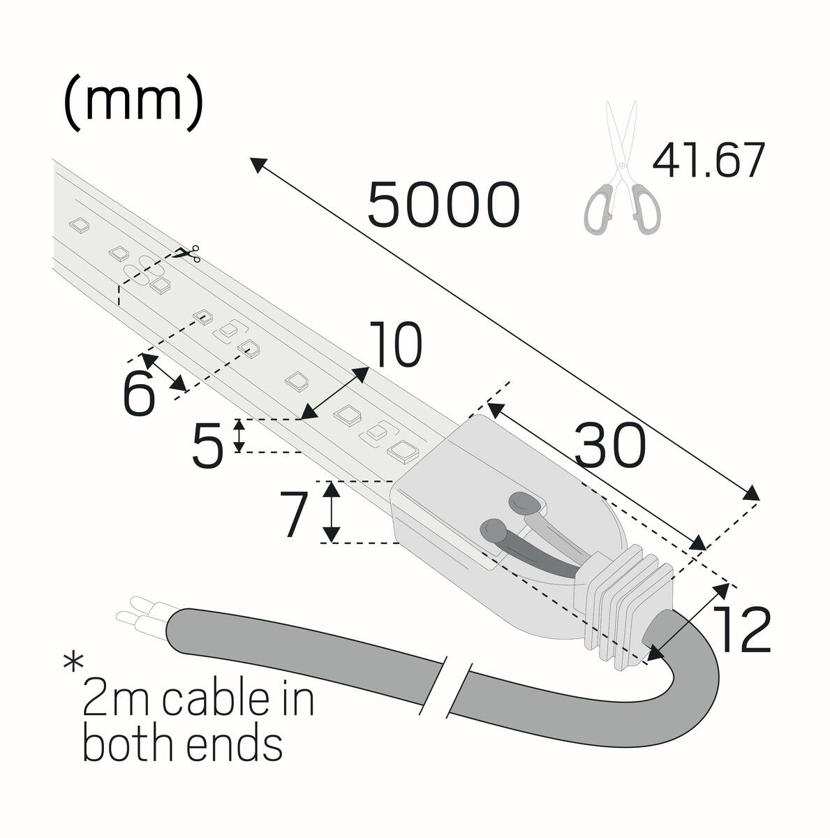 • Levereras med självhäftande tejp, 2m anslutningskabel i varje ände, clips och skruvar, ändhattar (5m)