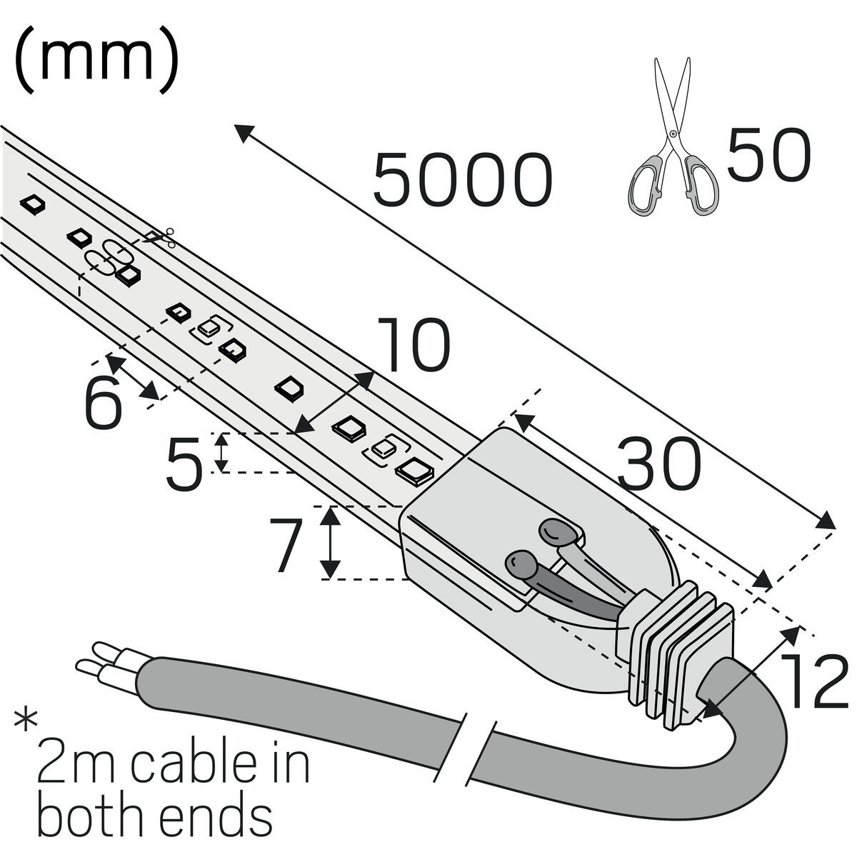 • Levereras med självhäftande tejp, 2m anslutningskabel i varje ände, clips och skruvar, ändhattar (5m)