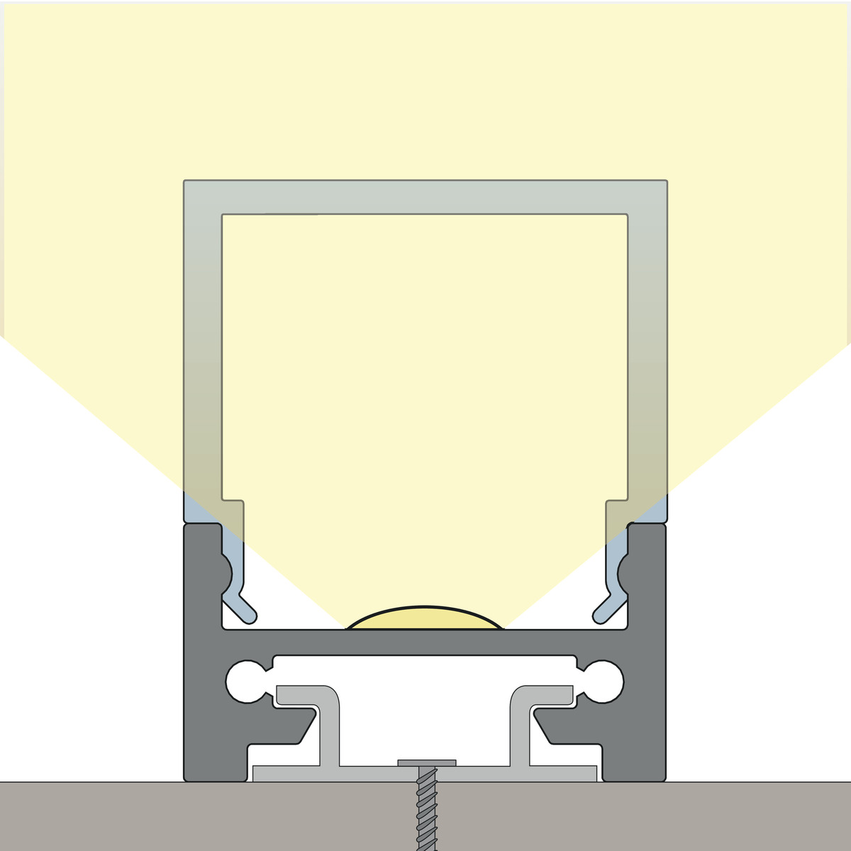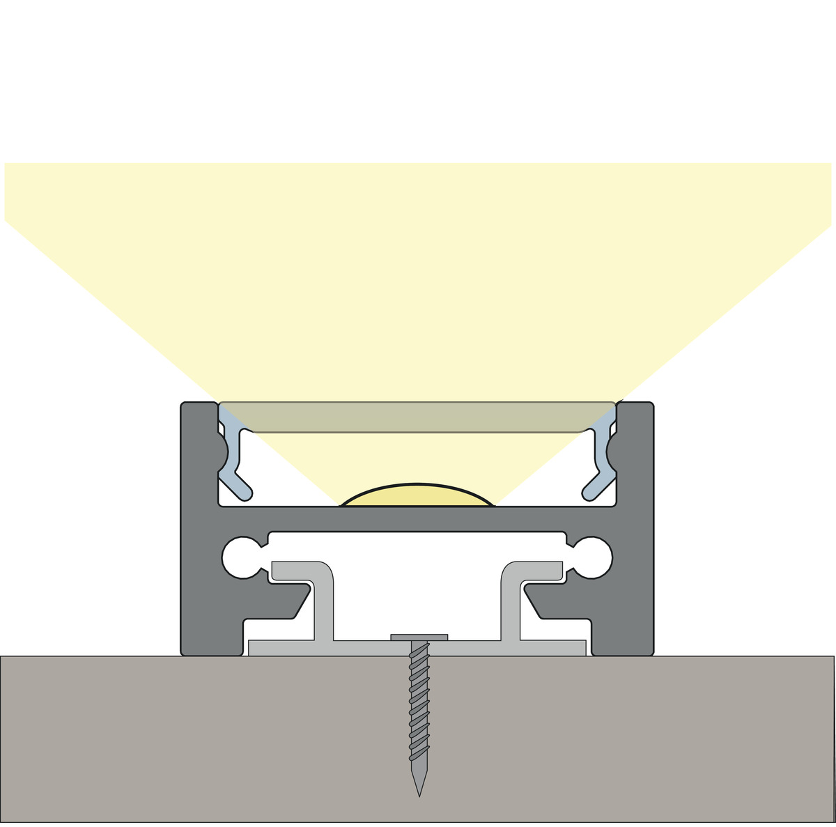 Kilformad profil som skapar en mjuk ljuseffekt. Finns i tre färger: vitt, svart och aluminium. Skapa både upp- och nerljus eller använda den för sidoljus i hörn. Profilen har plats för intern kabeldragning, vilket gör installationen snabbare och öppnar upp fler monteringsmöjligheter. Utanpåliggande profil som skapar ett dekorativt släpljus.