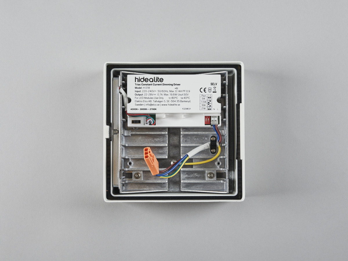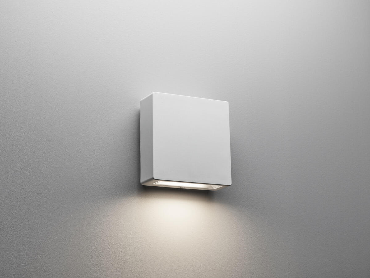 Väggarmatur i rektangulärt formspråk, integrerat fasdimringsbart drivdon och ljusutsläpp nedåt. Lys upp fasaden, skapa ett välkomnande intryck vid entrén, dimra enkelt ljuset till önskad nivå. IP65-utförande med armaturhus för tufft utomhusklimat. Lättinstallerad tack vare separat bakstycke med dubbla genomföringar och vidarekopplingsbar snabbplint för direkt anslutning till 230V. Distanser för utanpåliggande kabeldragning medföljer. Dimbar med de vanligaste dimrarna på marknaden.