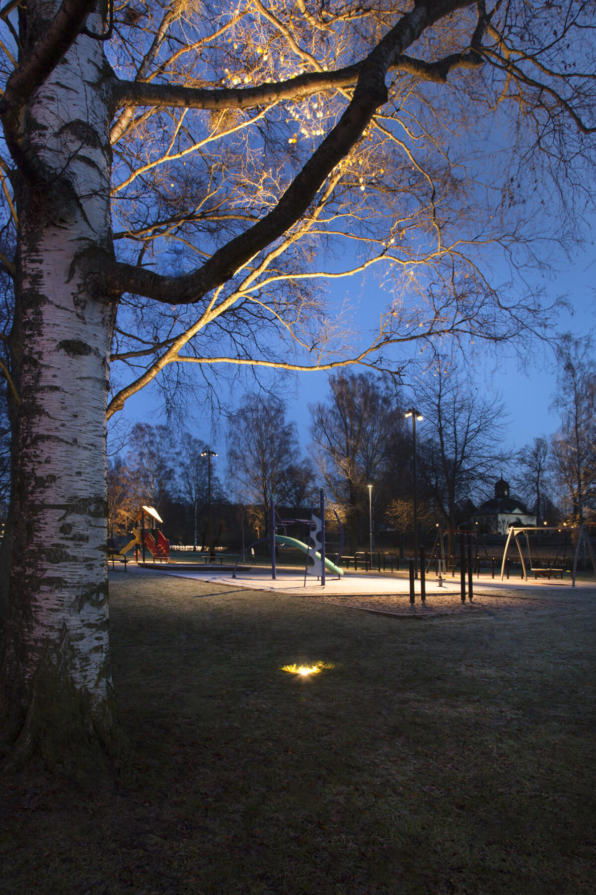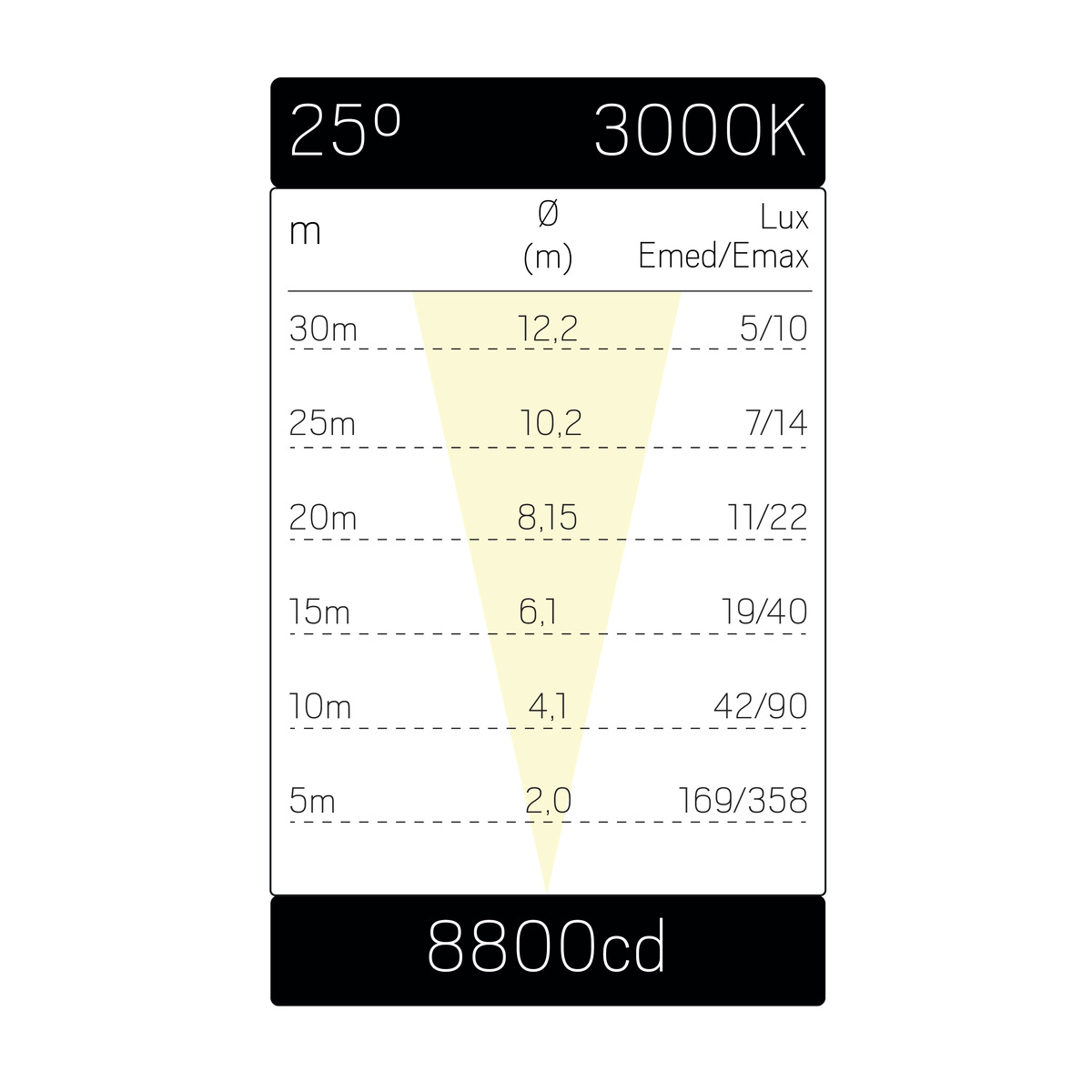 Energieffektiv markstrålkastare för offentlig miljö. Perfekt för till exempel parker, arenor och industrifastigheter. Nedsänkt LED-chip (COB) med modern reflektorteknik ger ett strålande och väl avbländat symmetriskt ljus. Armaturhus av gjuten aluminium, ytterring av rostfritt stål (316) och härdat skyddsglas. Kan monteras i mark eller gjutas in med den medföljande montageboxen. Levereras komplett med inbyggt drivdon, 2m gummikabel samt montagebox.