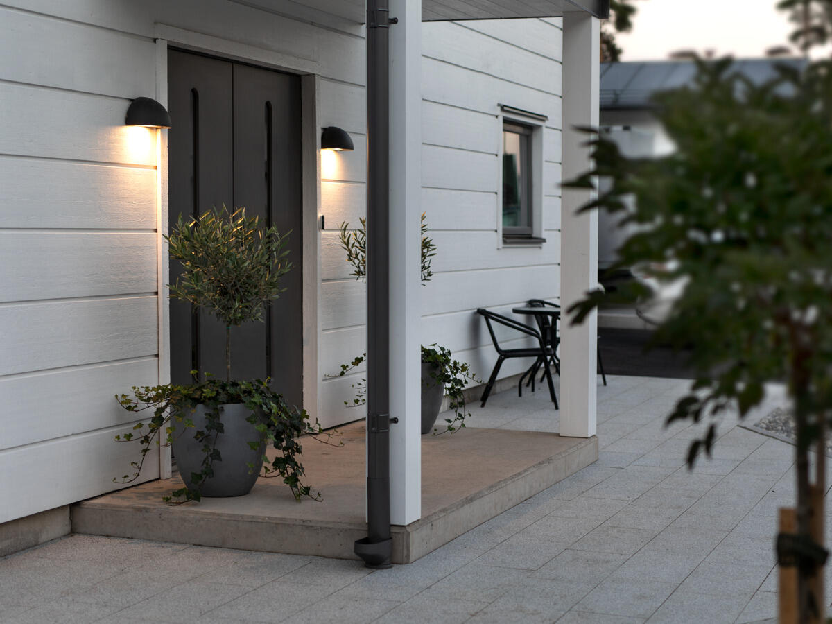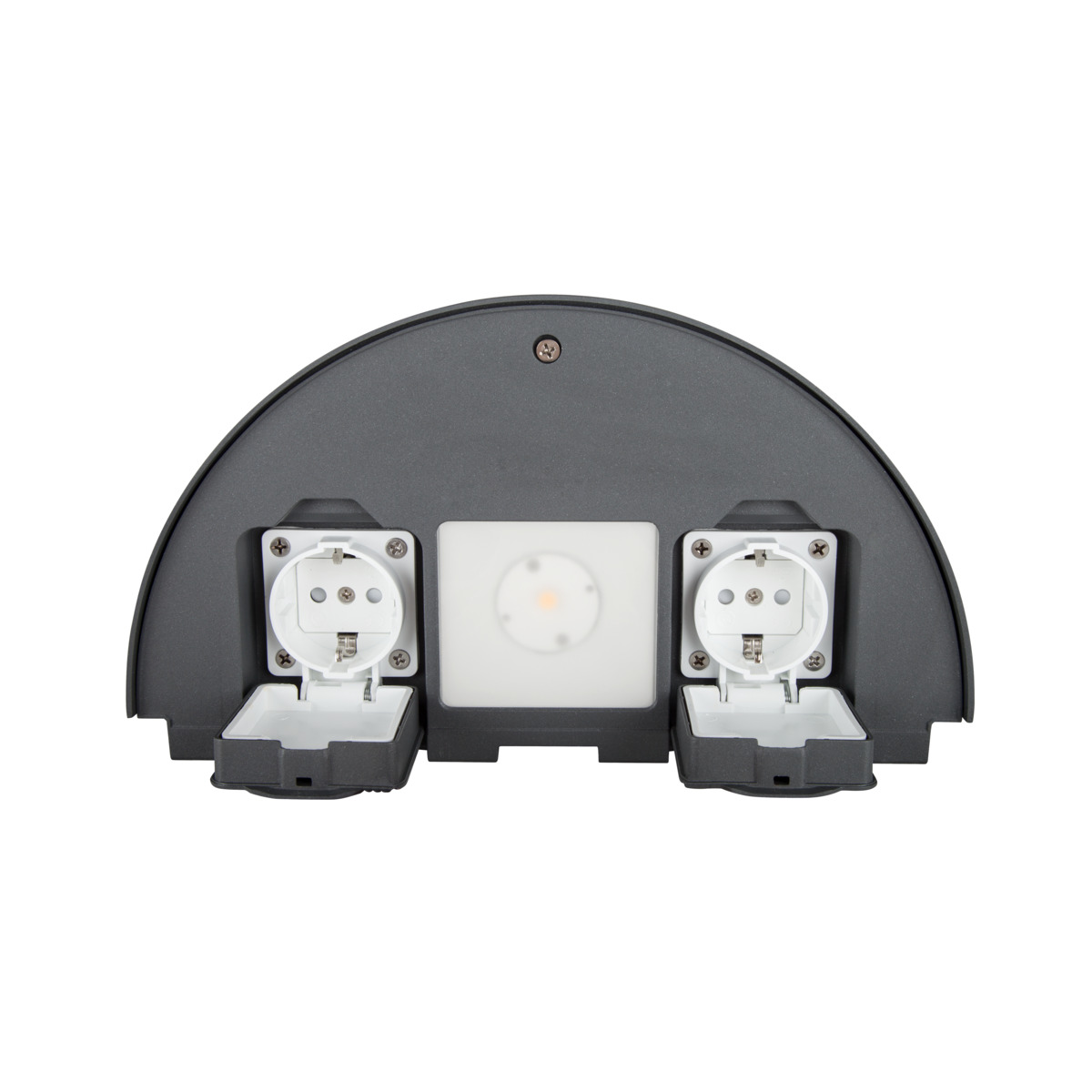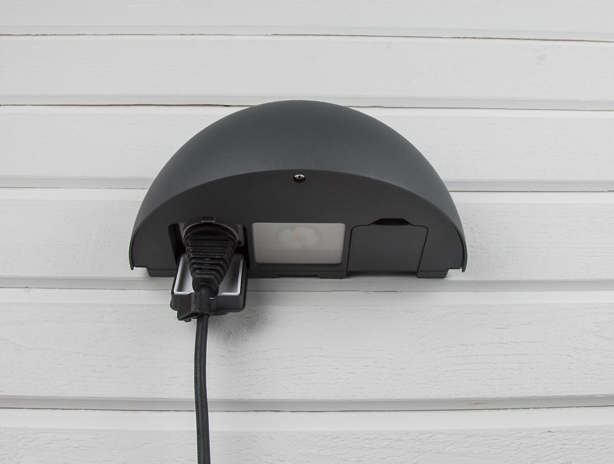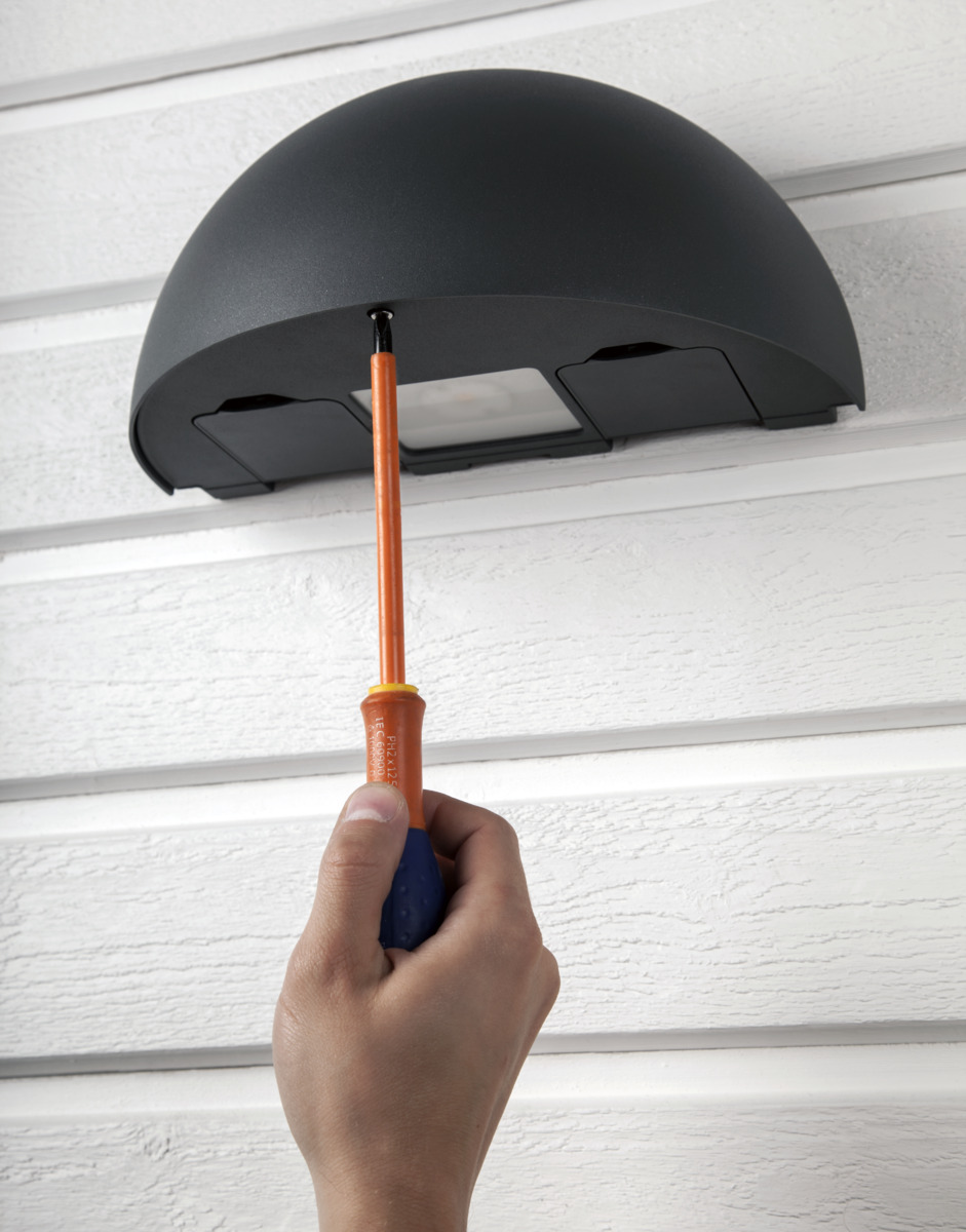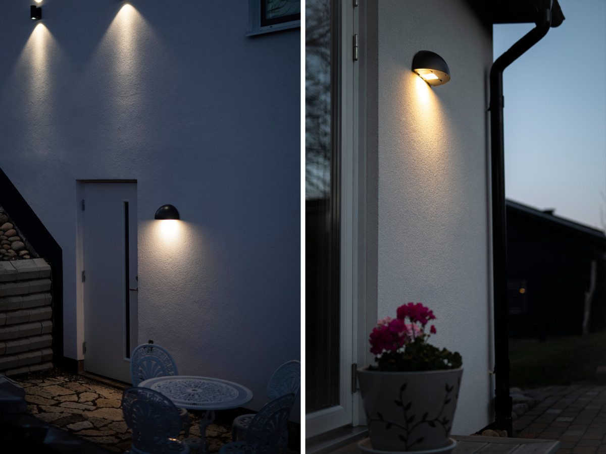 Fasadarmatur i traditionell design som ger ett behagligt ljus med en jämn och bred ljusbild på väggen. Armaturen finns med eller utan två integrerade eluttag på undersidan perfekt för trädgårdsredskap, el-grill eller vinterns dekorationsbelysning. Möjlighet finns att styra uttag och belysning var för sig. Mycket enkel installation tack vare separat stomme, få skruvar och gott om utrymme. Inbyggt drivdon med ställbar ljusnivå via DIP-Switch Power. Möjlighet till dimring finns via externt drivdon, se bruksanvisning.