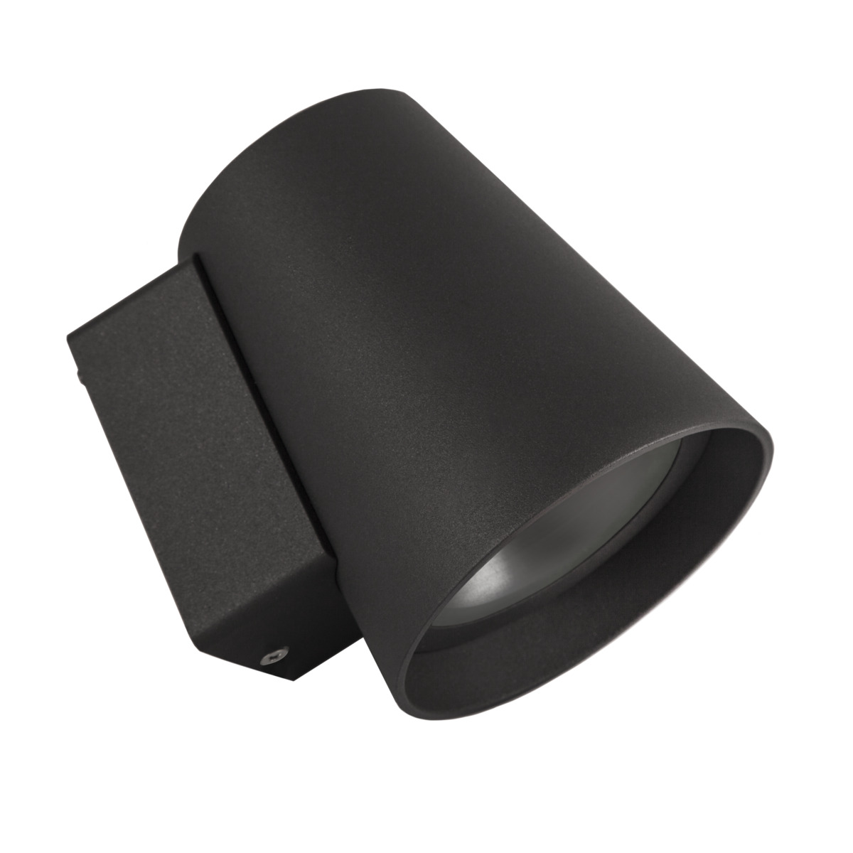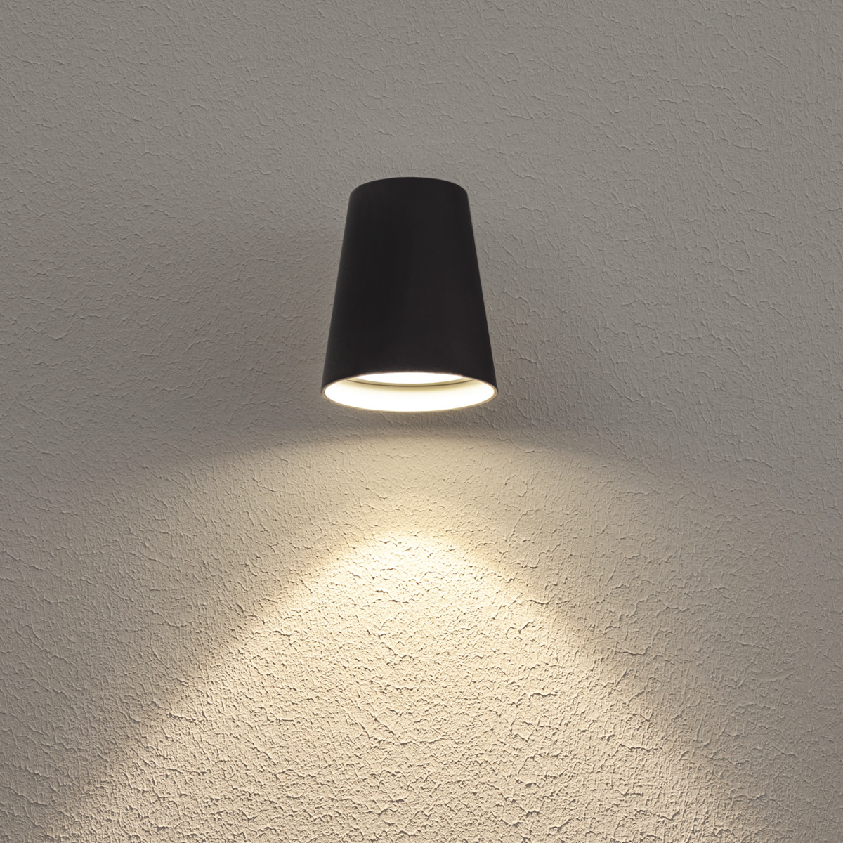 En nätt fasadarmatur med GU10-sockel i stilren konformad design med en asymmetrisk ljusbild som lyser upp både vägg och mark. Enkelt montage tack vare separat bakstycke med dubbla genomföringar och vidarekopplingsbar snabbplint. Distanser för utanpåliggande kabeldragning medföljer. IP65-klassad med tålig pulverlack för tuffa miljöer. Välj själv ljuskälla för önskad färgtemperatur och ljusstyrka.