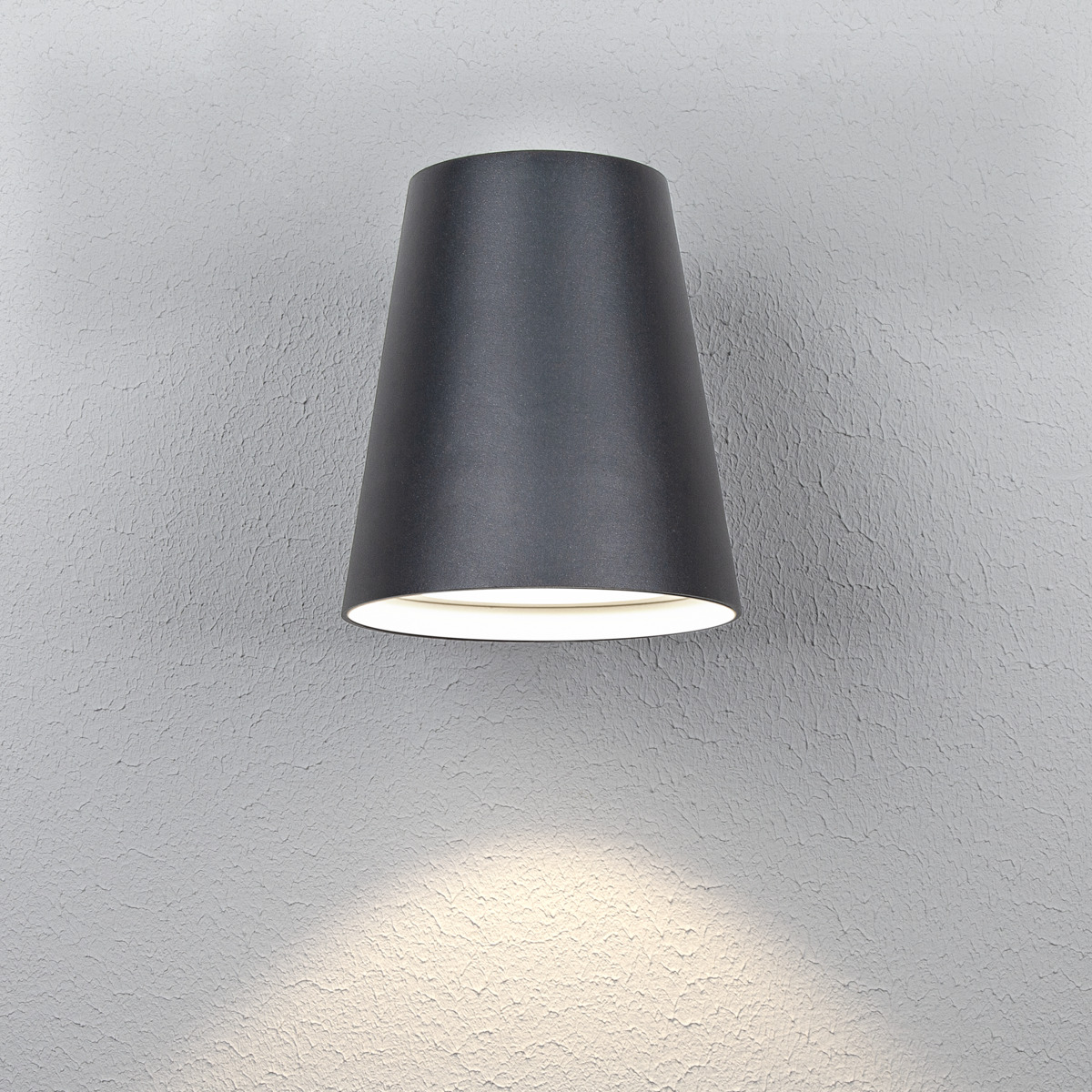 En nätt fasadarmatur i stilren konformad design. LED COB med reflektoroptik ger en asymmetrisk ljusbild som lyser upp både vägg och mark. Enkelt montage tack vare separat bakstycke med dubbla genomföringar och vidarekopplingsbar snabbplint. Distanser för utanpåliggande kabeldragning medföljer. IP65-klassad med tålig pulverlack för tuffa miljöer. Inbyggt drivdon med ställbar ljusnivå via DIP-Switch Power.